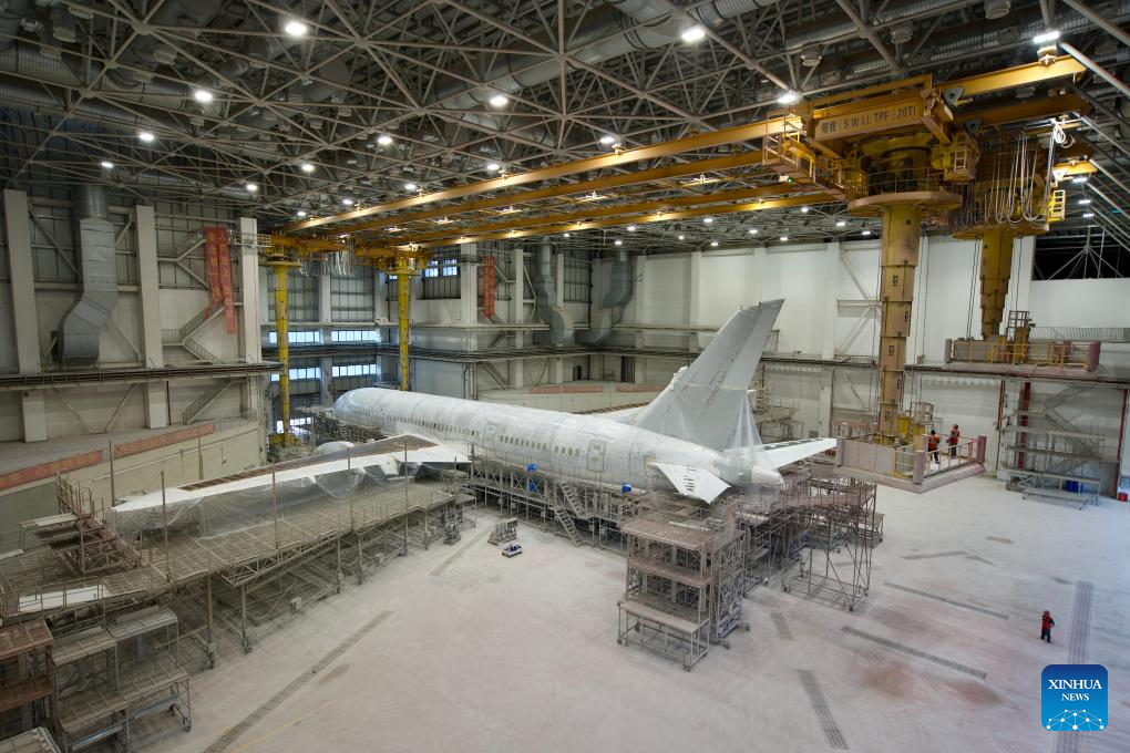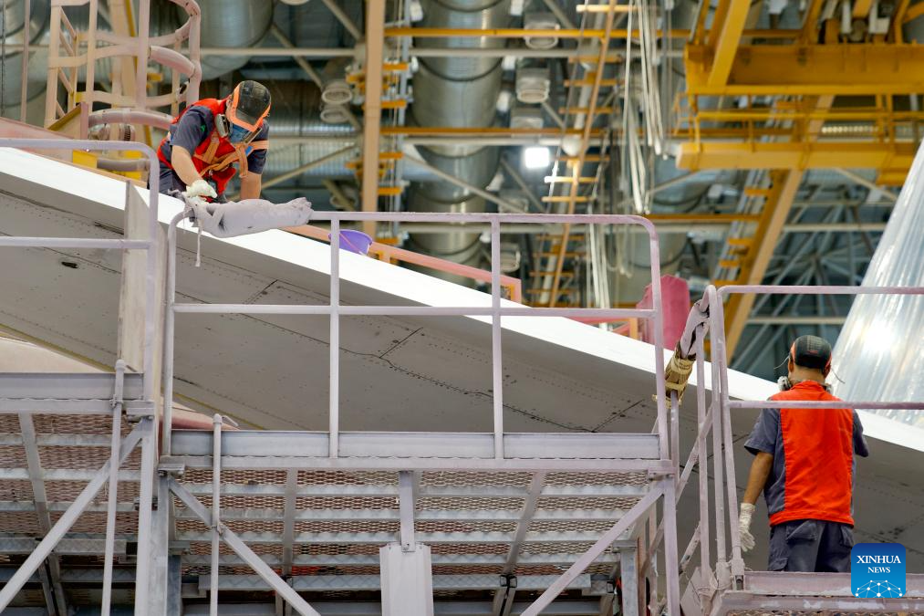 Workers of HNA Technic remove the original paint on an inbound airplane at the one-stop aircraft maintenance base of Hainan Free Trade Port in Haikou, south China's Hainan Province, Oct. 21, 2024. Inbound airplanes in Hainan are eligible for preferential treatments of the free trade port including exemption of cash deposite as well as duty-free fuel and maintenance supplies. The comprehensive bonded zone of Haikou Airport reaped more than 20 billion yuan (about 2.81 billion U.S. dollars) worth of bonded maintenance services for these airplanes in the first three quarters of 2024. (Xinhua/Zhang Liyun)