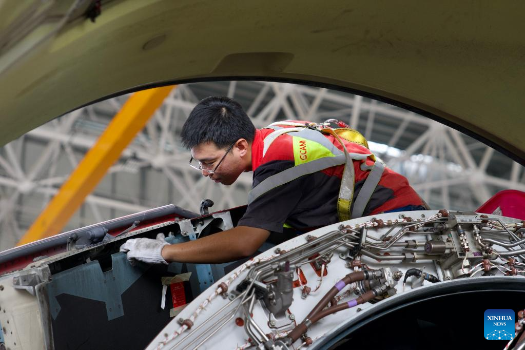 A worker of HNA Technic maintains an inbound airplane at the one-stop aircraft maintenance base of Hainan Free Trade Port in Haikou, south China's Hainan Province, Oct. 21, 2024. Inbound airplanes in Hainan are eligible for preferential treatments of the free trade port including exemption of cash deposite as well as duty-free fuel and maintenance supplies. The comprehensive bonded zone of Haikou Airport reaped more than 20 billion yuan (about 2.81 billion U.S. dollars) worth of bonded maintenance services for these airplanes in the first three quarters of 2024. (Xinhua/Zhang Liyun)