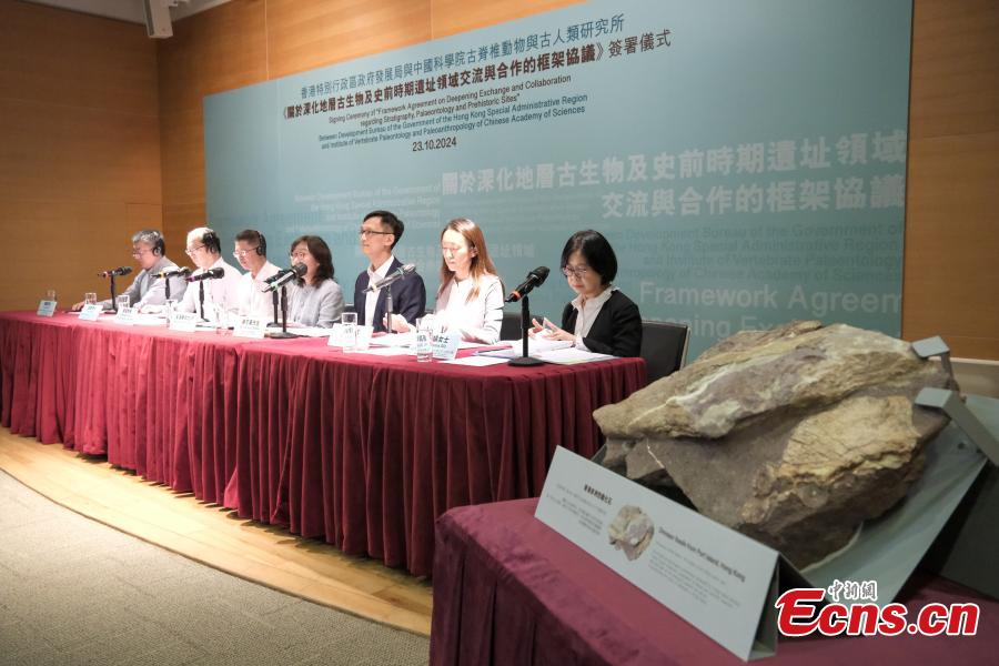 Experts attend a press conference on the discovery of the dinosaur bone fossils discovered on Port Island in the Hong Kong Administrative Region, Oct. 23, 2024. (Photo: China News Service/Chen Yongnuo)