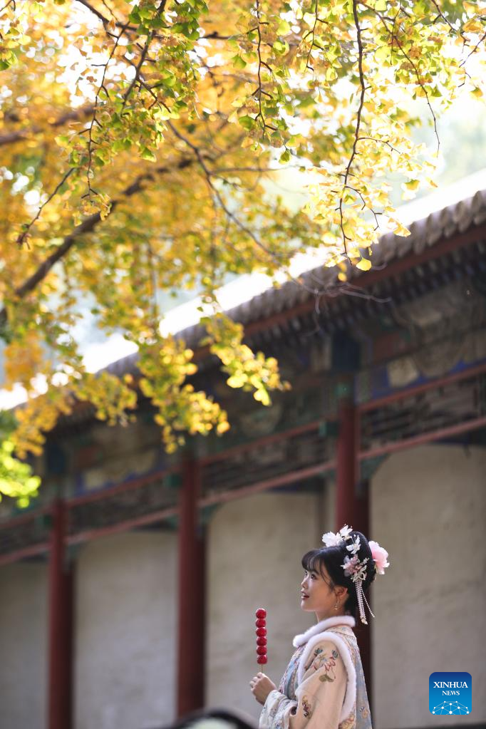 A woman in traditional Chinese costume poses for photos at the Summer Palace in Beijing, capital of China, on Oct. 24, 2024. The Summer Palace is China's largest imperial park and among the most noted classical gardens in the world. In 1998, it was listed as one of the World Heritage Sites by UNESCO. (Photo by Na Yuqi/Xinhua)