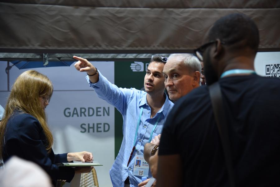 Foreign visitors communicate under a pergola produced by Zhejiang Hooeasy Technology Co., Ltd. at the 136th Canton Fair, officially known as the China Import and Export Fair, in Guangzhou, south China's Guangdong Province, Oct. 23, 2024. (Xinhua/Hong Zehua)