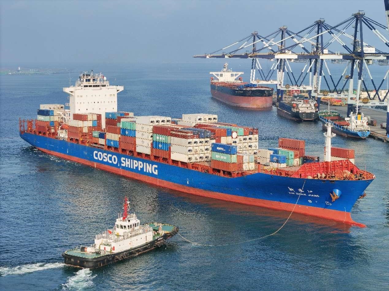 The first vessel of a container shipping route run by Chinese state-owned multinational conglomerate COSCO Shipping from Yantai, east China's Shandong province, to Southeast Asia sets sail from the Yantai port, Aug. 15, 2024. (People's Daily Online/Tang Ke)