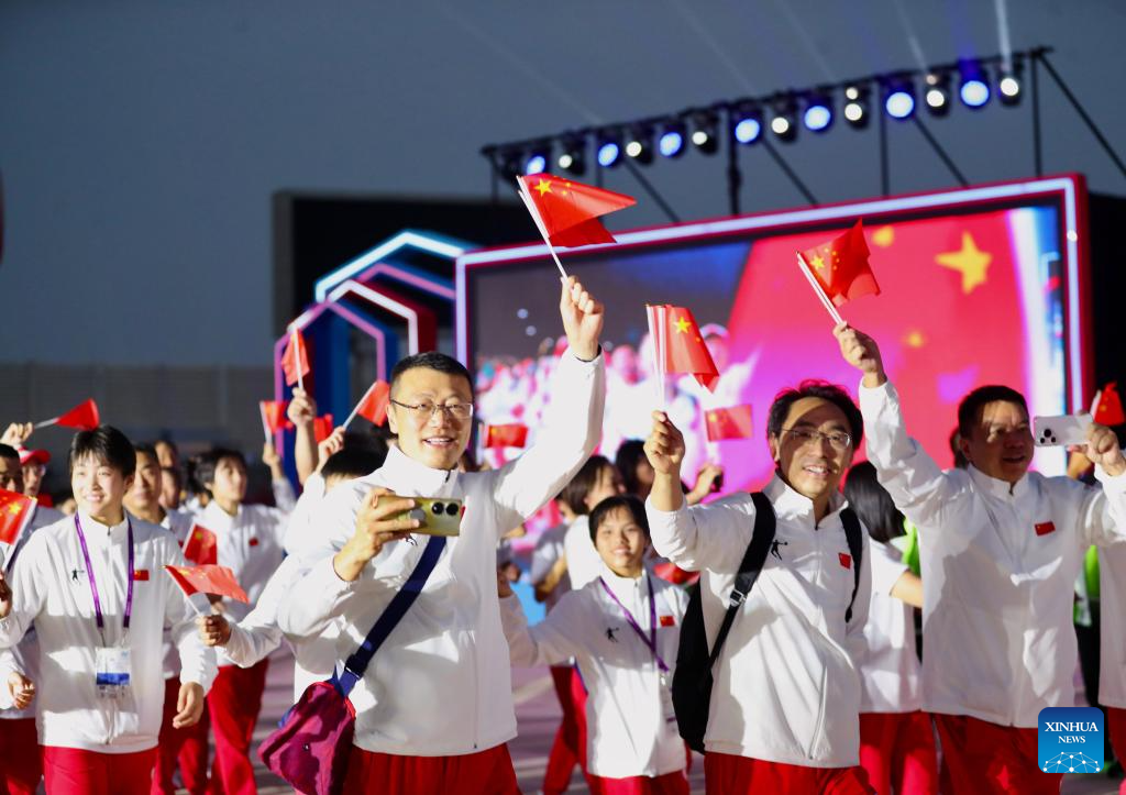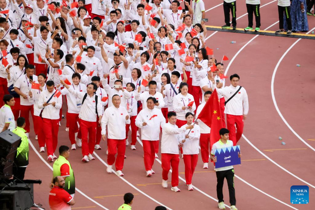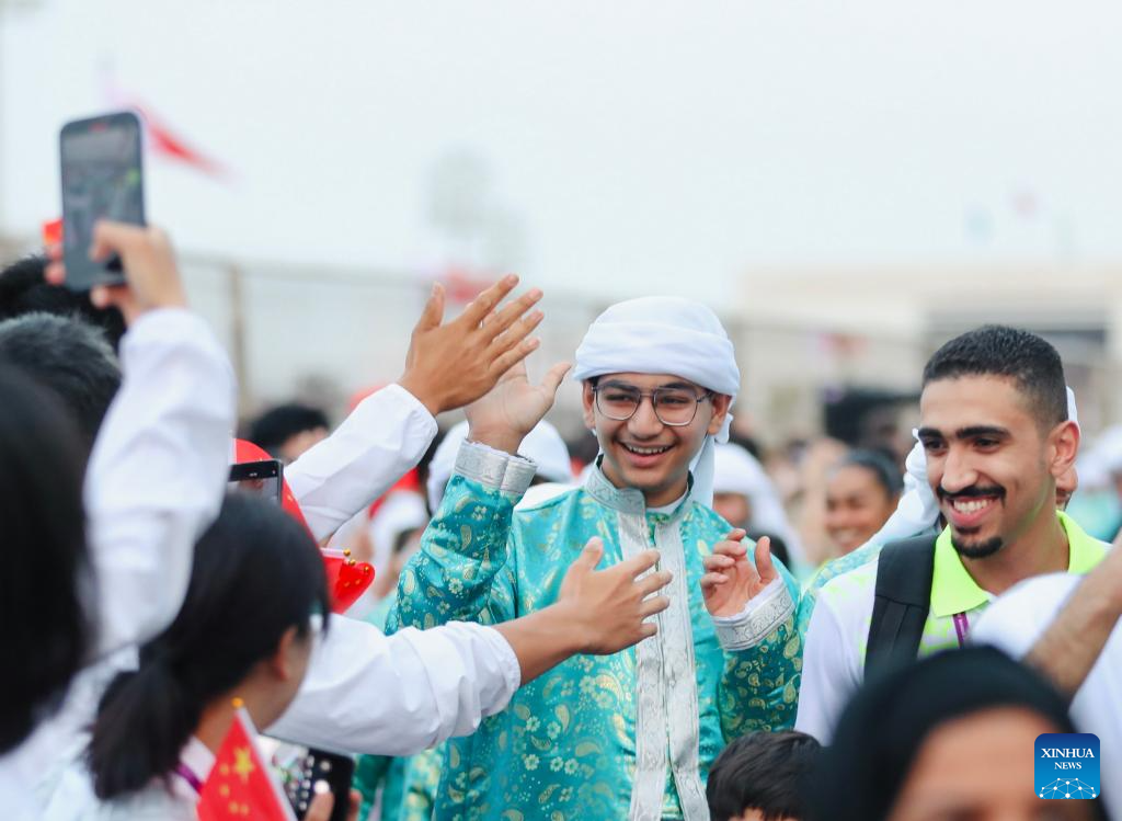 Members of Chinese delegation arrive for the opening ceremony of the International School Sport Federation (ISF) Gymnasiade Bahrain 2024 in Bahrain, Oct. 24, 2024. (Xinhua/Luo Chen)
