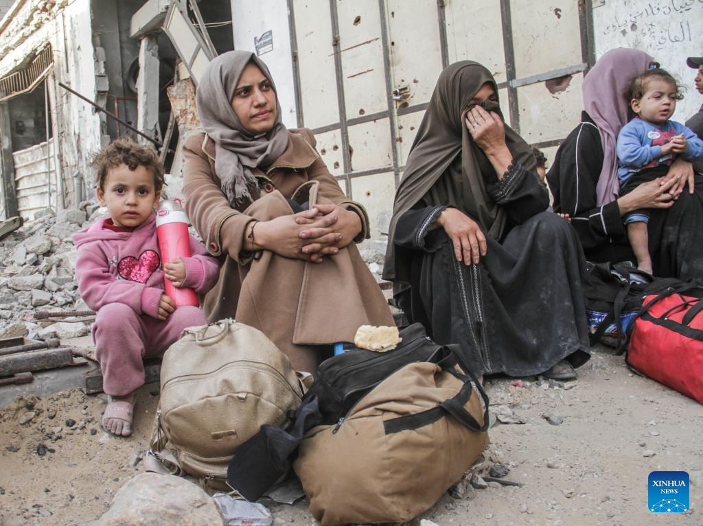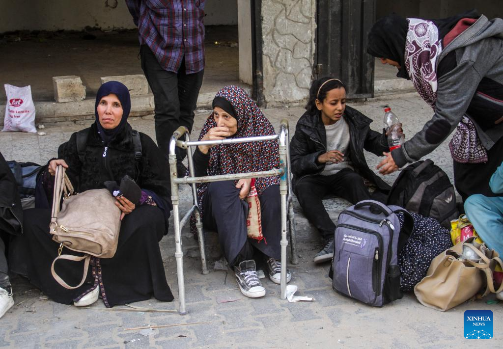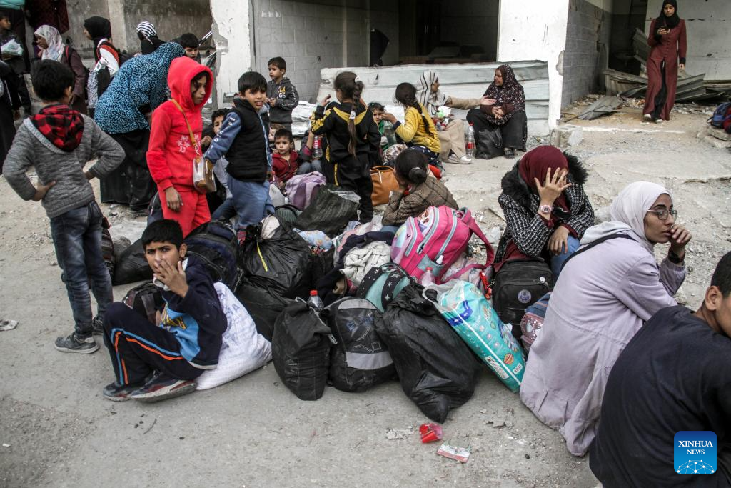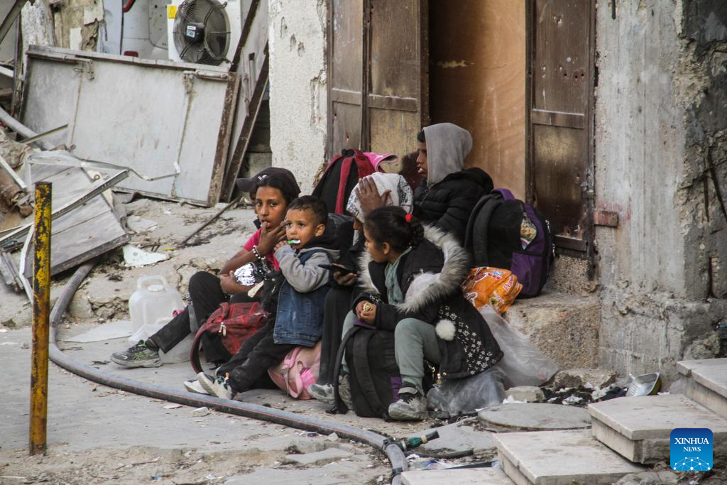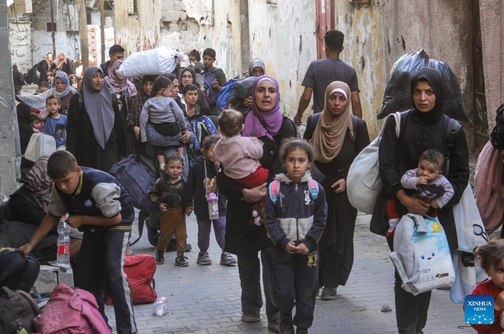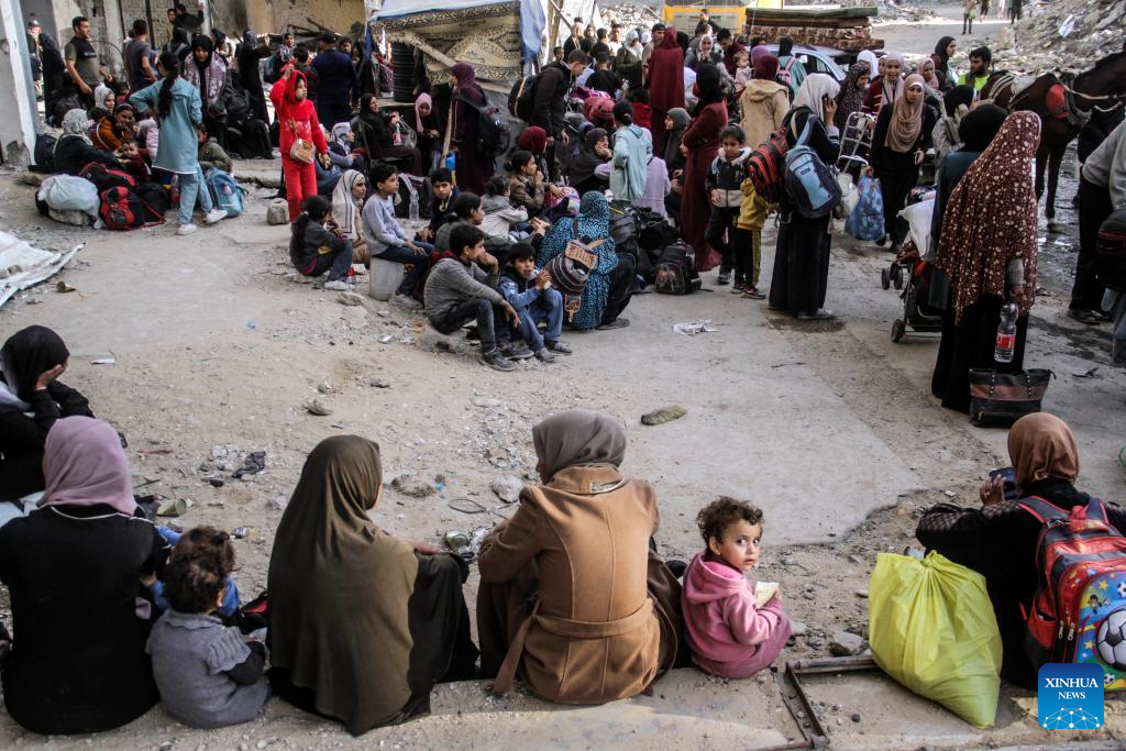 People forced to leave the town of Beit Lahia by Israeli army are seen in Jabalia refugee camp, northern Gaza Strip, on Oct. 25, 2024. At least 53 Palestinians were killed in Israeli strikes on the northern and southern Gaza Strip from Thursday night through Friday, Palestinian sources said. (Photo by Mahmoud Zaki/Xinhua)