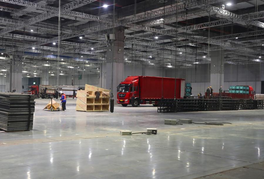 Workers get the venue ready for the upcoming 7th China International Import Expo (CIIE) at National Exhibition and Convention Center (Shanghai), east China's Shanghai, Oct. 22, 2024. (Xinhua/Fang Zhe)