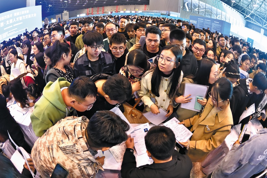 Job seekers attend a career fair in Taiyuan, Shanxi province, on Saturday. A total of 25,900 positions were offered at the fair by 720 institutions and enterprises. (WEI LIANG/CHINA NEWS SERVICES)