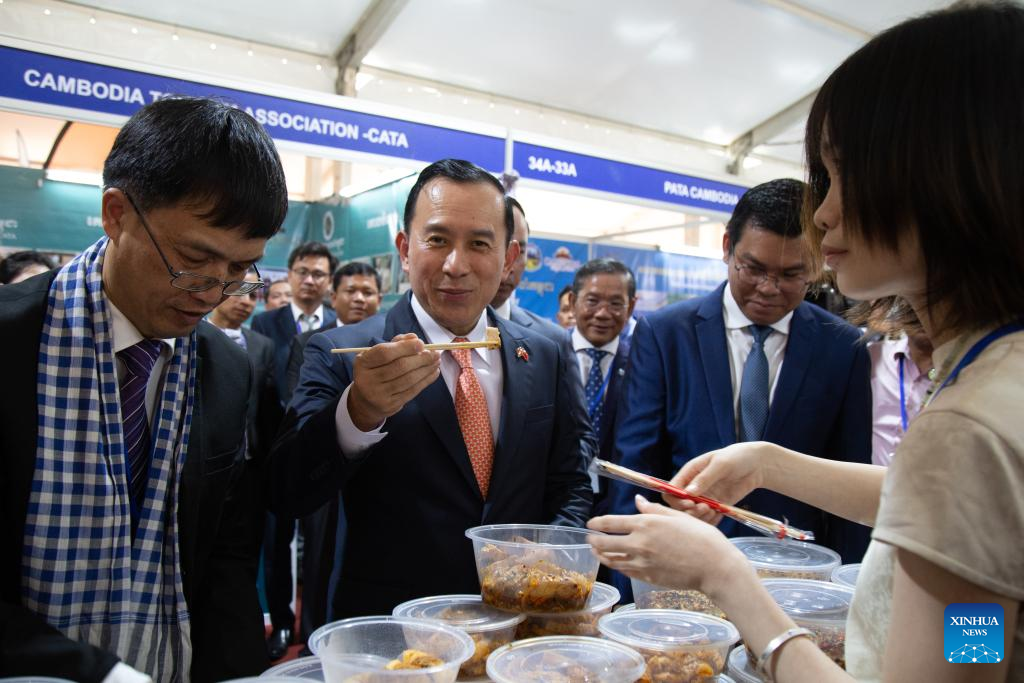 Cambodian Minister of Tourism Huot Hak (C) tastes a Chinese dish during the Cambodia-China Gastronomy Week in Siem Reap province, Cambodia on Oct. 26, 2024. A two-day Cambodia-China Gastronomy Week kicked off here in northwest Cambodia's Siem Reap province on Saturday, attracting food lovers. (Photo by Sao Khuth/Xinhua)