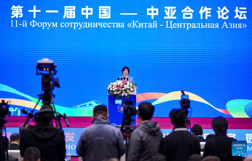 Shen Yueyue, vice chairperson of the National Committee of the Chinese People's Political Consultative Conference and chairperson of the Good-Neighborliness, Friendship and Cooperation Commission of the Shanghai Cooperation Organization, delivers a keynote speech at the opening ceremony of the 11th China-Central Asia Cooperation Forum in Yinchuan, capital of northwest China's Ningxia Hui Autonomous Region, Oct. 26, 2024. (Xinhua/Feng Kaihua)