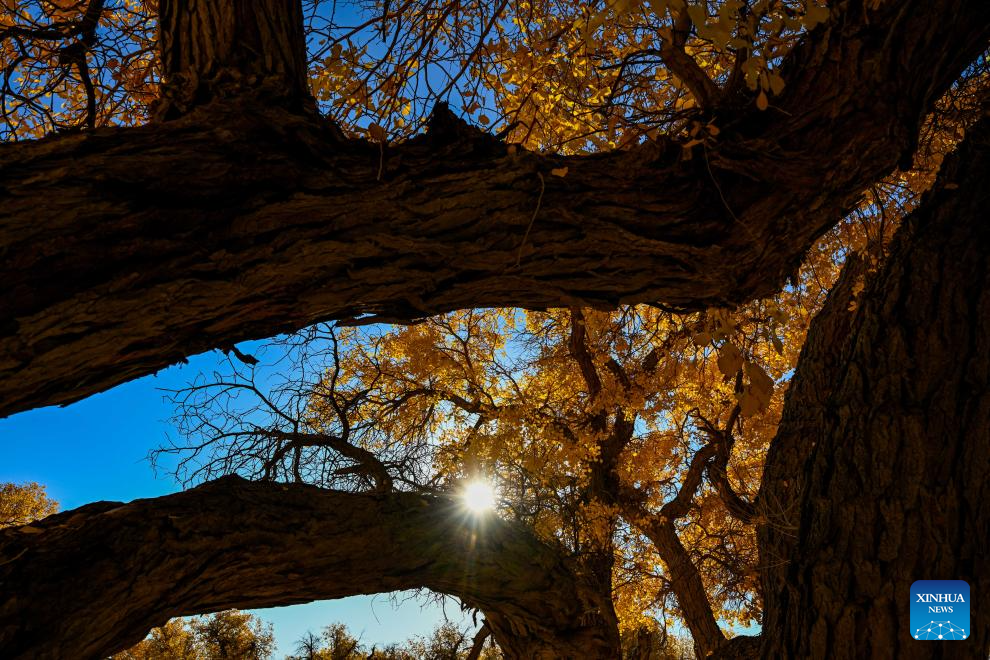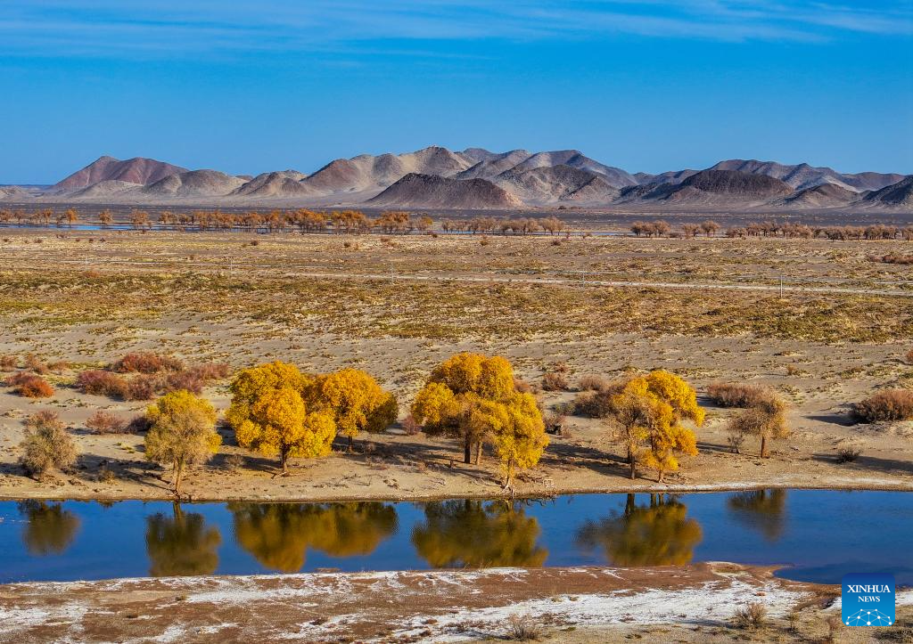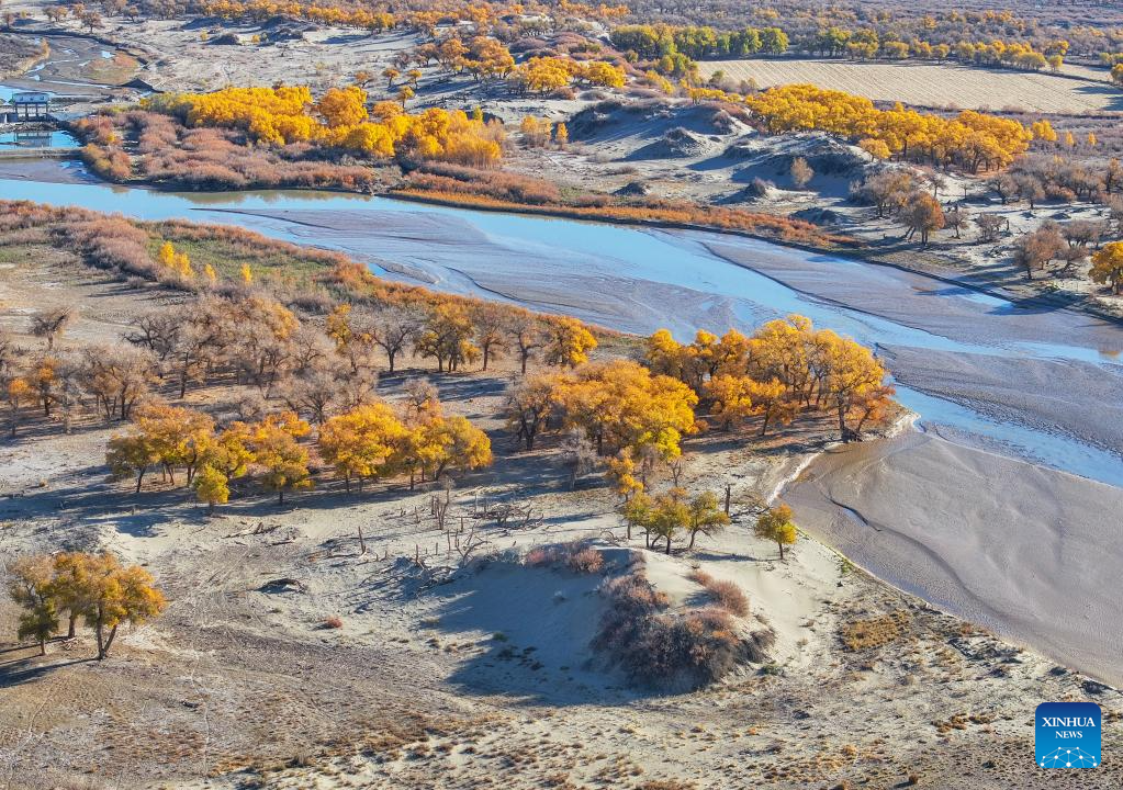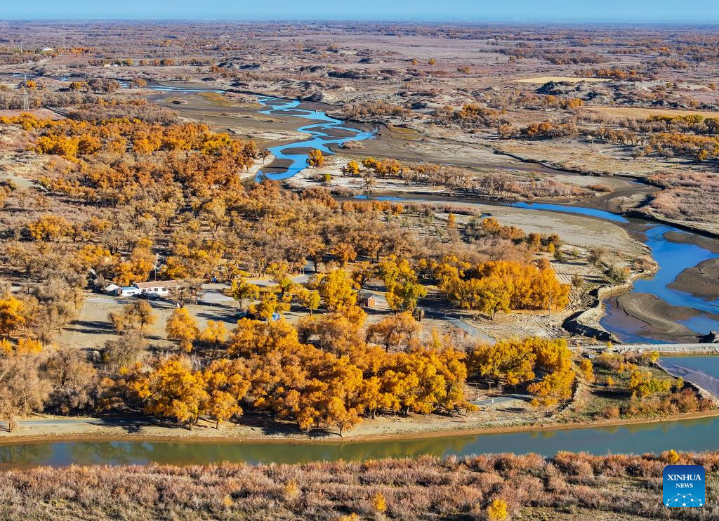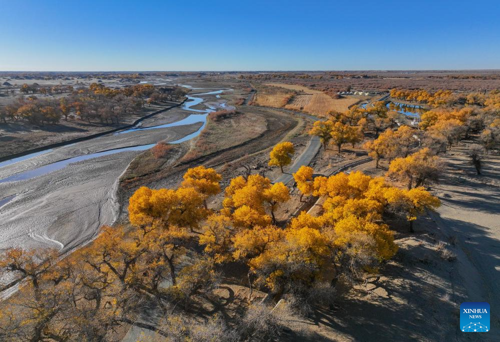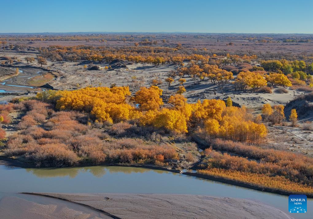 This photo taken on Oct. 27, 2024 shows the autumn scenery of the desert poplar (populus euphratica) forest in Ejina Banner of Alxa League, north China's Inner Mongolia Autonomous Region. (Xinhua/Lian Zhen)