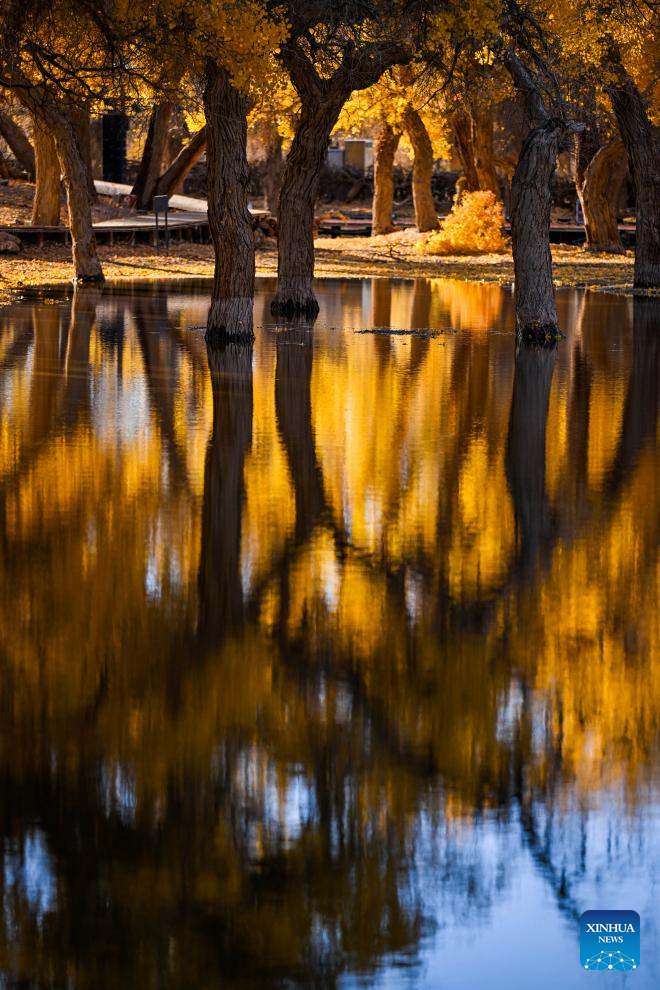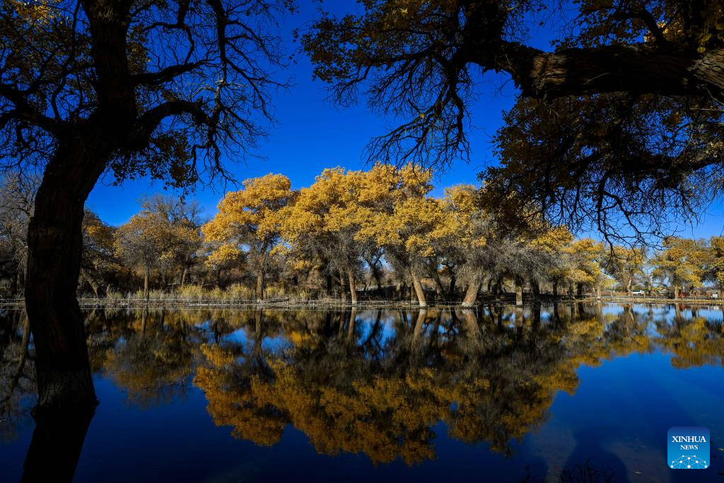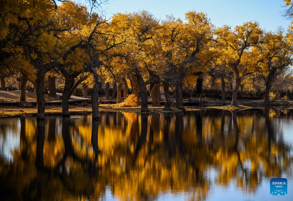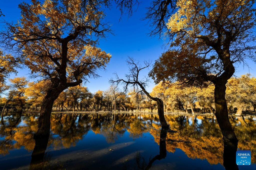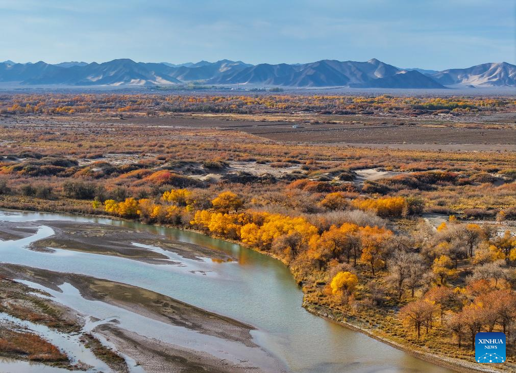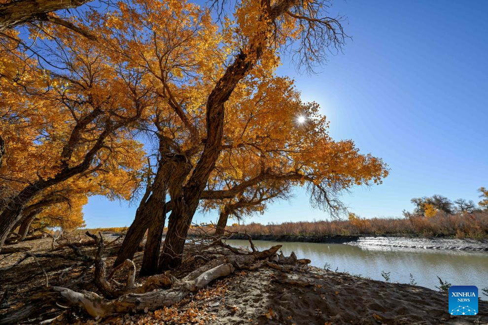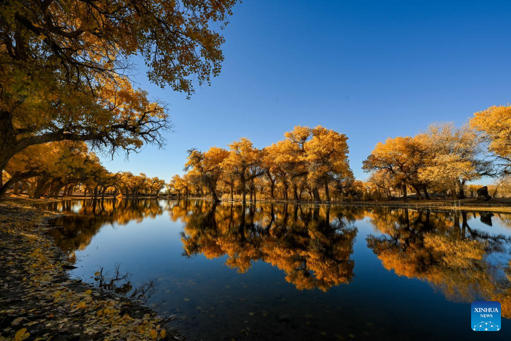 This photo taken on Oct. 27, 2024 shows the autumn scenery of the desert poplar (populus euphratica) forest in Ejina Banner of Alxa League, north China's Inner Mongolia Autonomous Region. (Xinhua/Lian Zhen)