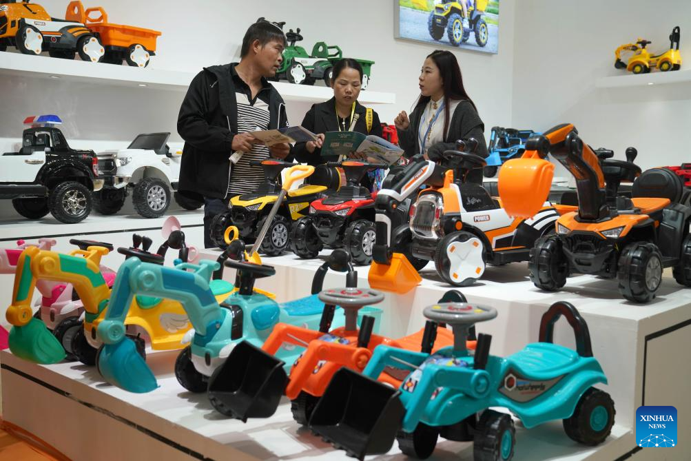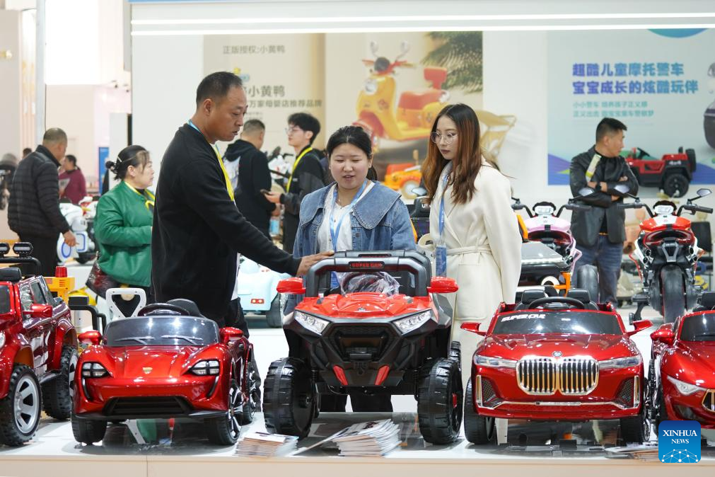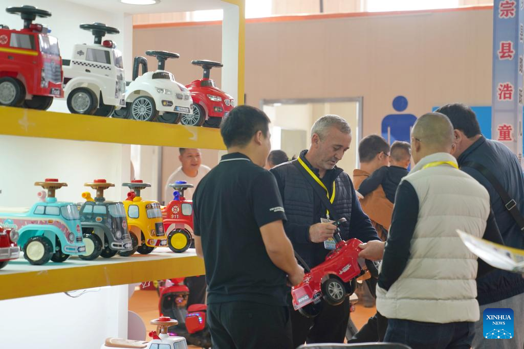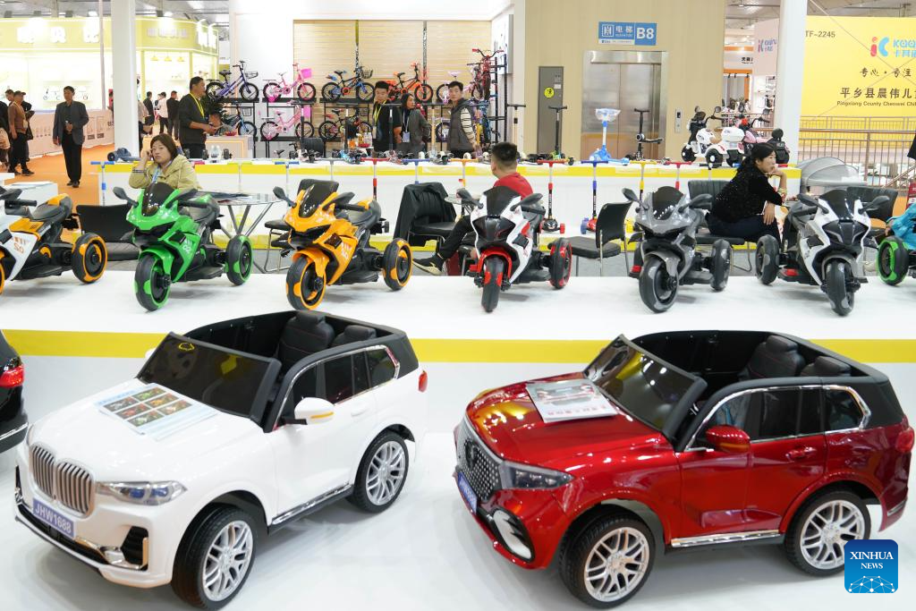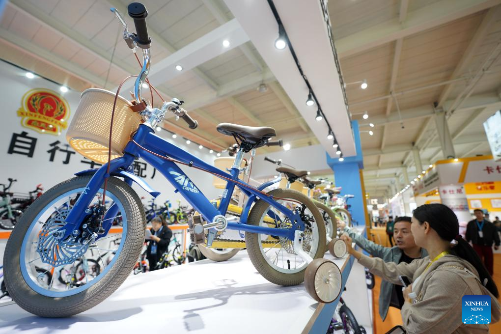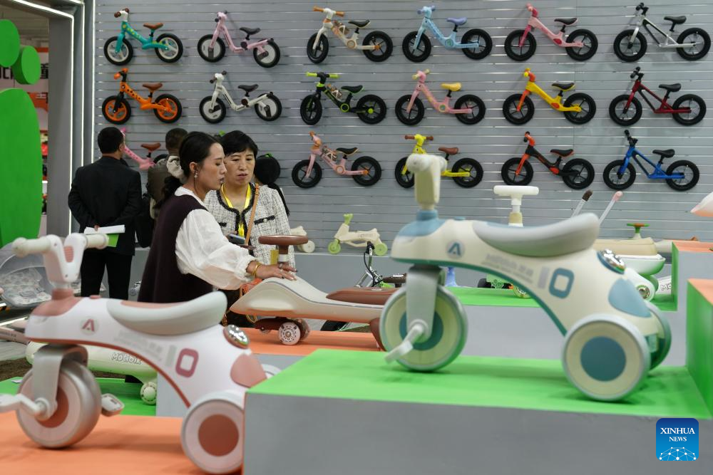 Merchants visit the 18th International Bicycles, Baby Strollers and Toys Fair in Pingxiang County, north China's Hebei Province, Oct. 26, 2024. The fair opened here on Saturday, with more than 3,000 booths and attracting merchants from over 80 countries and regions. Pingxiang of Hebei Province is renowned for its industry of bicycles, baby strollers and toys. (Xinhua/Mu Yu)
