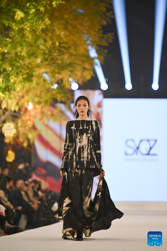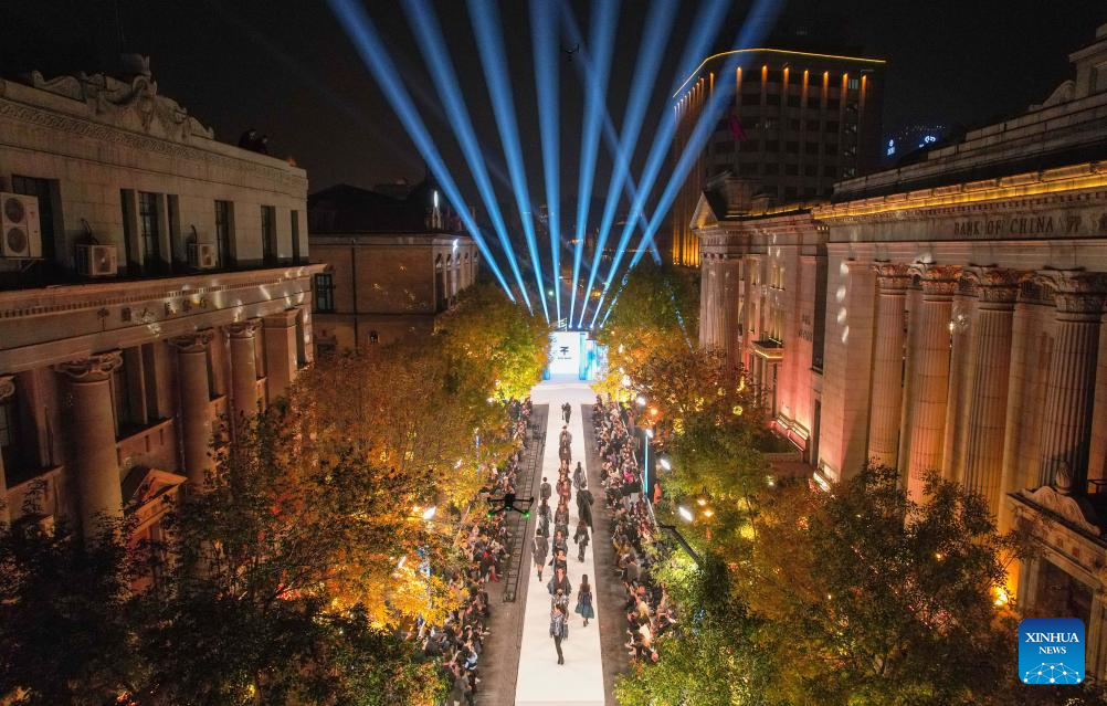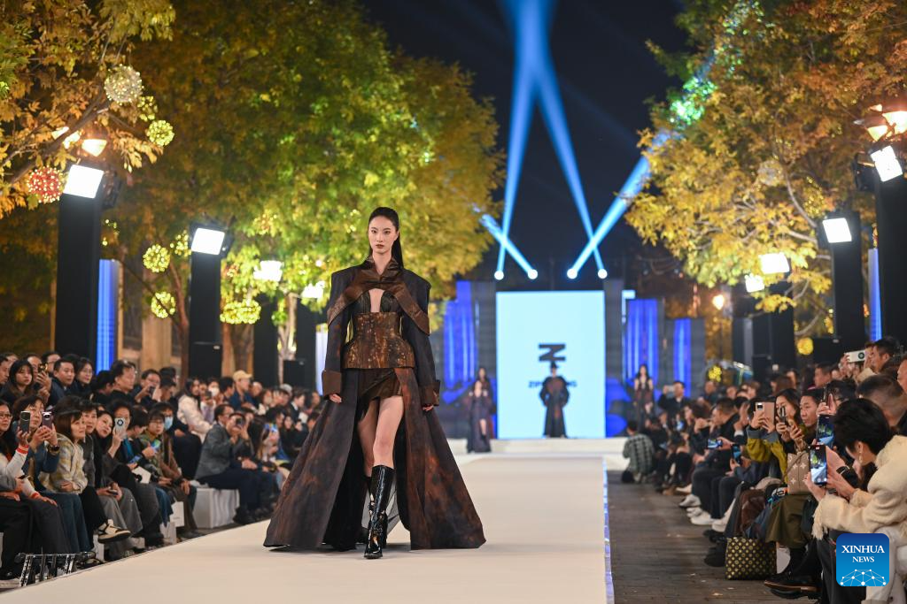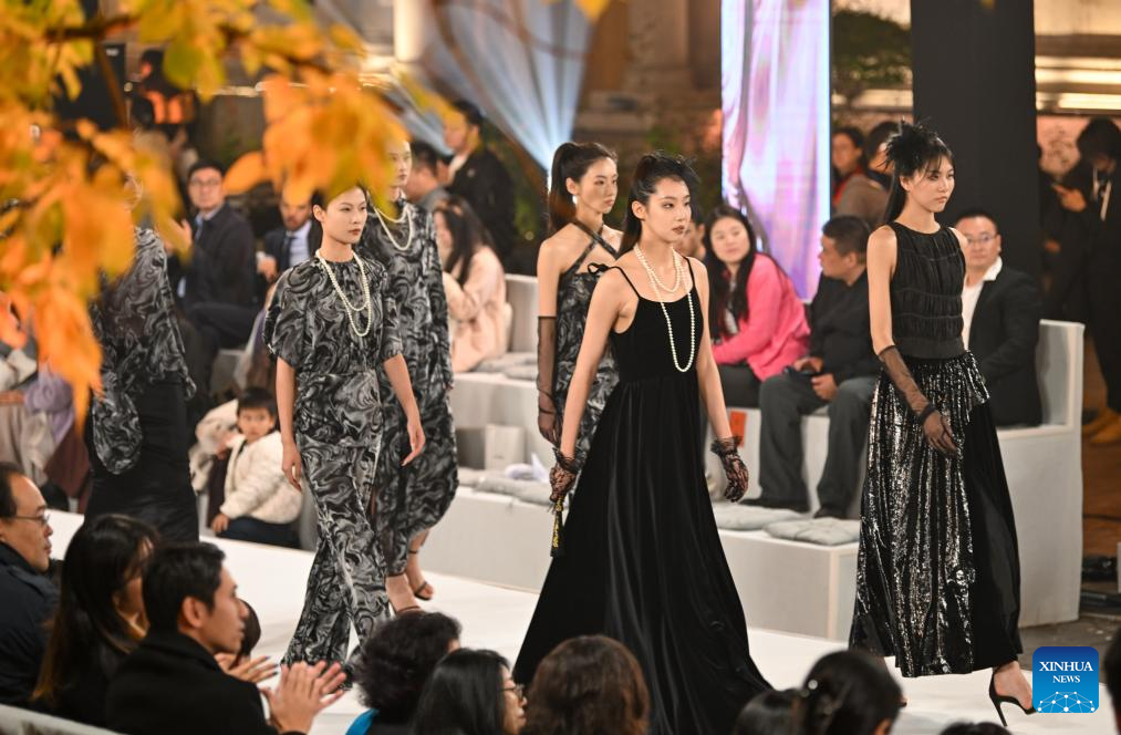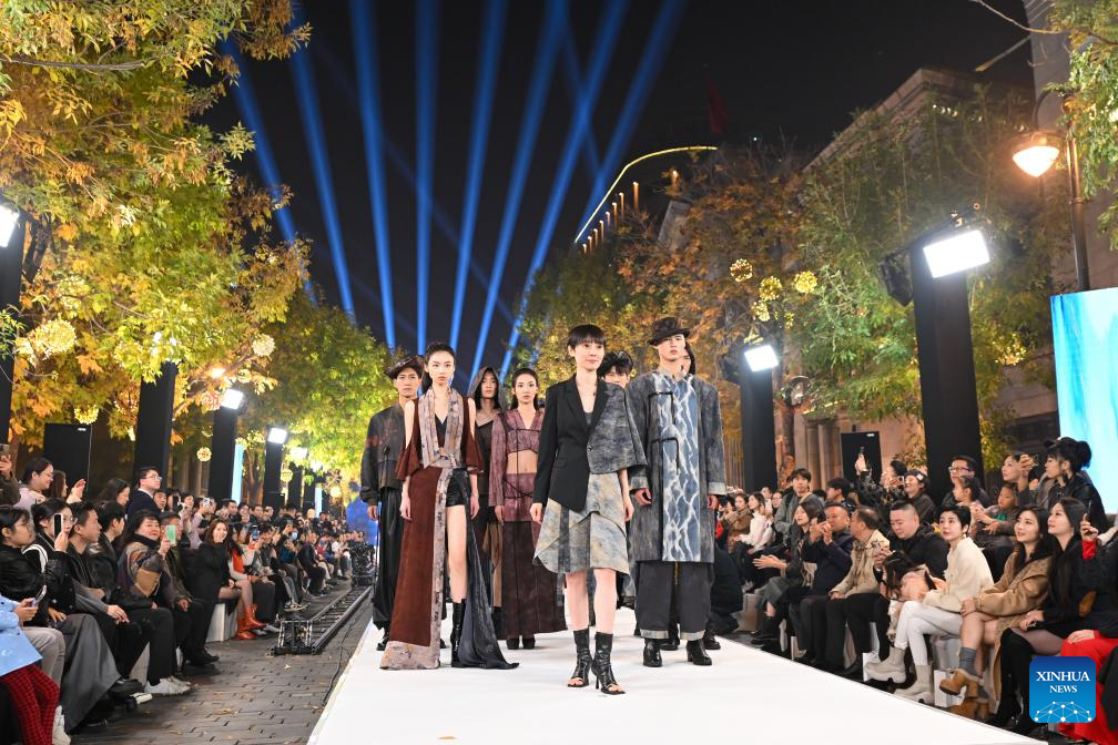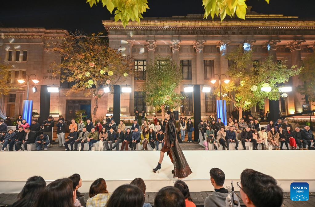 Models present creations during a fashion show at Jiefang North Road historical and cultural block in north China's Tianjin, Oct. 26, 2024. A fashion show was staged in the century-old Jiefang North Road historical and cultural block Saturday, presenting creations by a Chinese brand and many Chinese designers against a background of old buildings featuring Western classical styles. (Xinhua/Sun Fanyue)