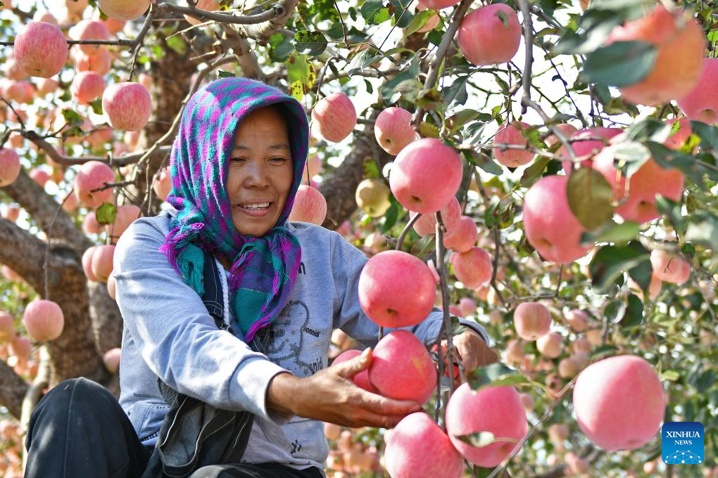 A farmer picks apples at a farm in Gaotuan Town in Fushan District of Yantai, east China's Shandong Province, Oct. 28, 2024. At present, farmers in many areas of the country are embracing the harvest season of this year while preparing for next year's planting. (Photo by Sun Wentan/Xinhua)