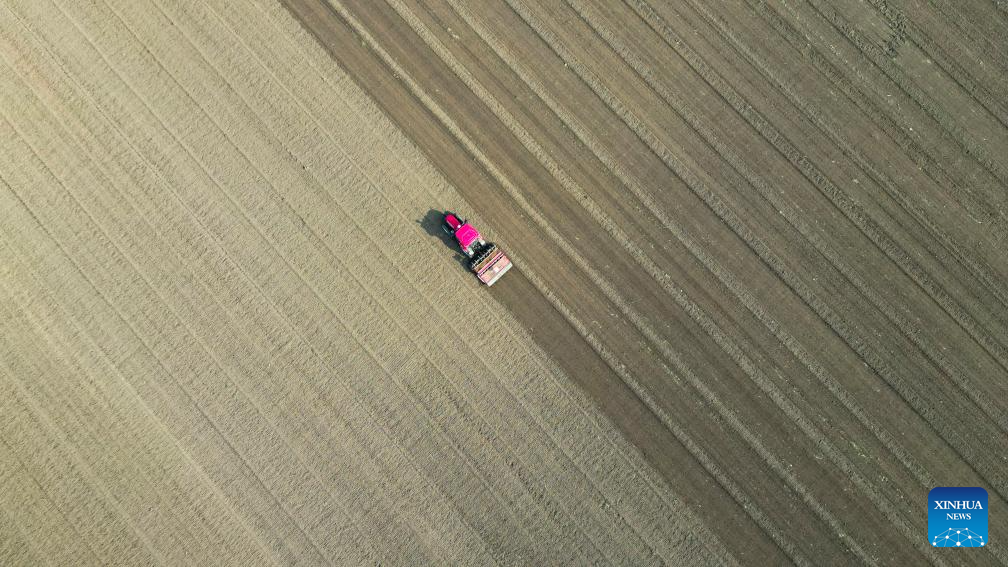 An aerial photo taken on Oct. 28, 2024 shows a tractor sowing wheat in Xiaozhang Village of Guangrao County, east China's Shandong Province. At present, farmers in many areas of the country are embracing the harvest season of this year while preparing for next year's planting. (Photo by Liu Yunjie/Xinhua)