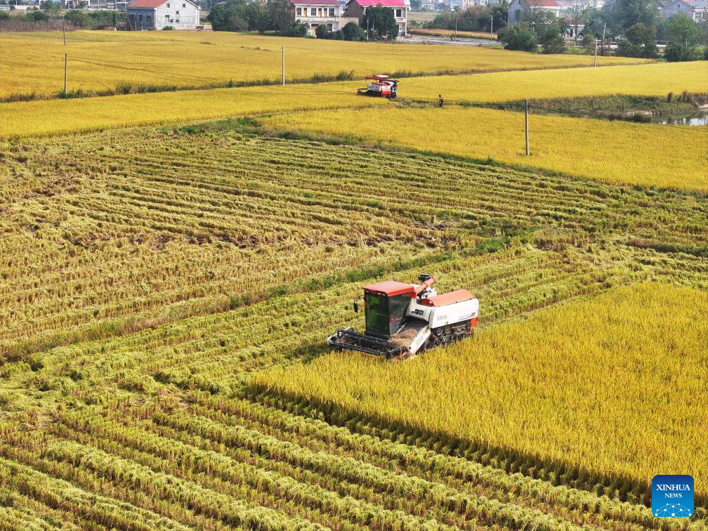 An aerial photo taken on Oct. 28, 2024 shows a harvester working in a late rice field in Daijiahe Village of Lixian County, Changde City, central China's Hunan Province. At present, farmers in many areas of the country are embracing the harvest season of this year while preparing for next year's planting. (Photo by Bai Yipu/Xinhua)