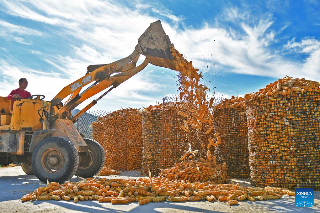 A farmer collects dried corn for storage in Gaotuan Village in Fushan District of Yantai, east China's Shandong Province, Oct. 28, 2024. At present, farmers in many areas of the country are embracing the harvest season of this year while preparing for next year's planting. (Photo by Sun Wentan/Xinhua)