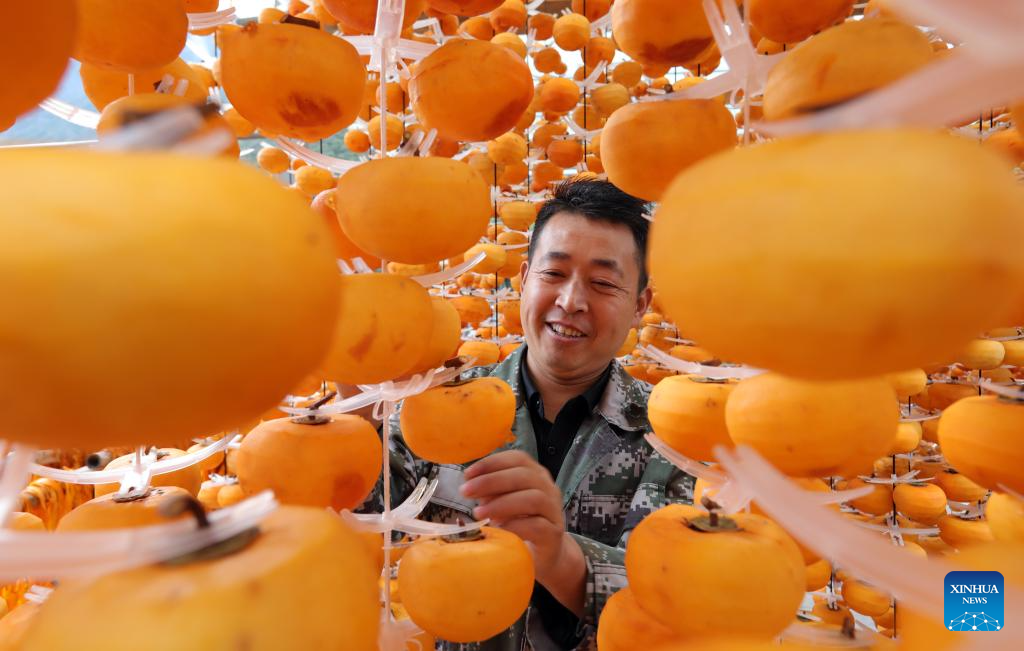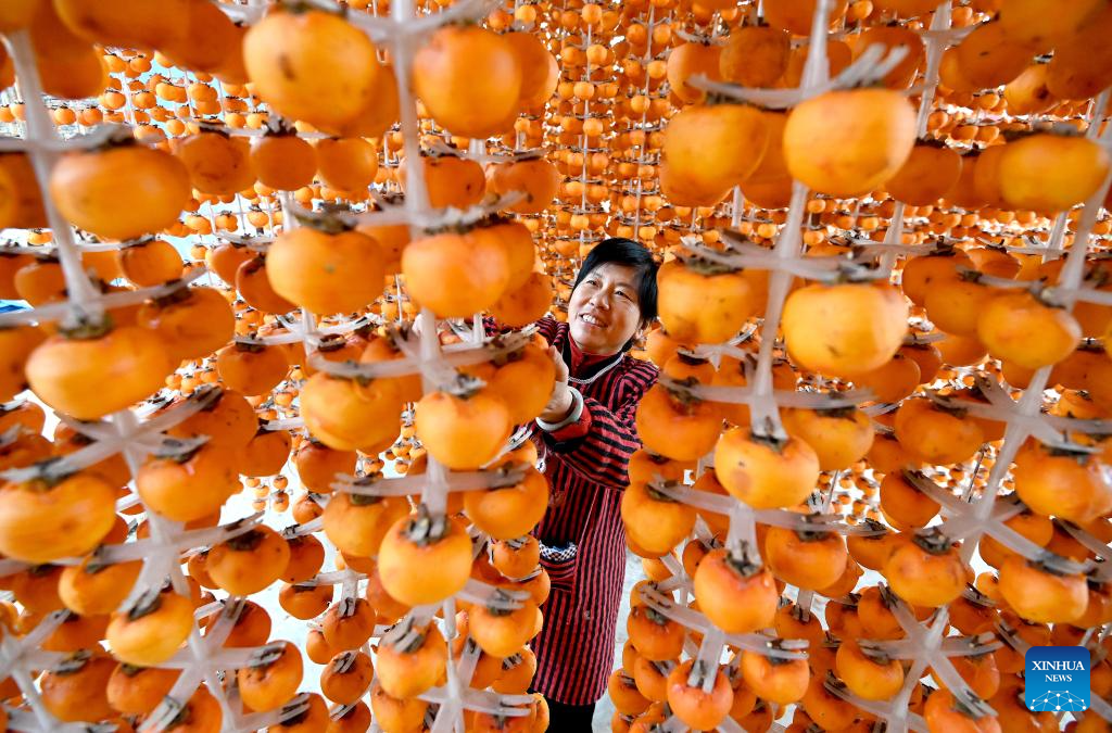 A farmer hangs and airs persimmons in Beijiabi Village of Cixian County, Handan City, north China's Hebei Province, Oct. 28, 2024. At present, farmers in many areas of the country are embracing the harvest season of this year while preparing for next year's planting. (Photo by Hao Qunying/Xinhua)