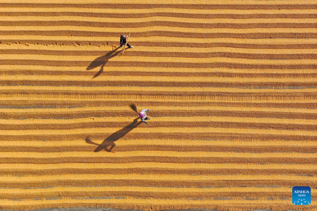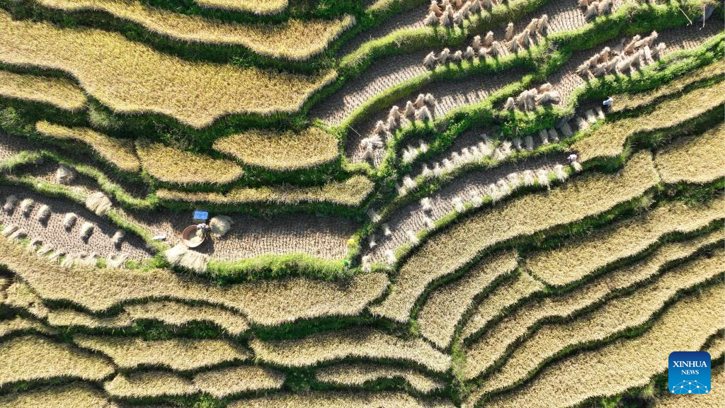 An aerial drone photo taken on Oct. 27, 2024 shows farmers harvesting late rice in Wangli Village of Hehua Town, Tengchong City, southwest China's Yunnan Province. At present, farmers in many areas of the country are embracing the harvest season of this year while preparing for next year's planting. (Photo by Gong Zujin/Xinhua)