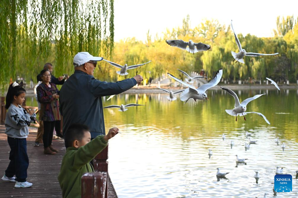 People feed red-billed gulls at Haibao park in Yinchuan, northwest China's Ningxia Hui Autonomous Region, Oct. 28, 2024. Tens of thousands of red-headed gulls have arrived at the lakes and wetland parks in Yinchuan City.