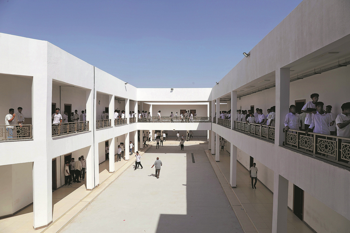 As the school bell rang, students hurried into their classrooms. The lively courtyard fell silent, allowing the cheerful sounds of reading to stand out.