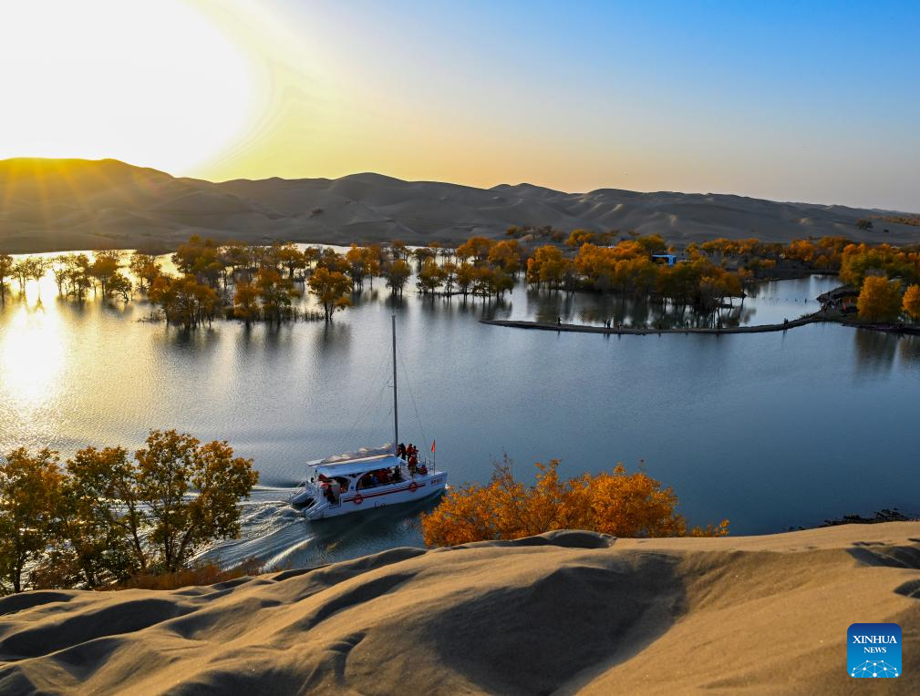 A cruise ship loaded with tourists sails on a lake in the Huludao scenic area in Bayingolin Mongolian Autonomous Prefecture, northwest China's Xinjiang Uygur Autonomous Region, Oct. 25, 2024. (Xinhua/Chen Shuo)