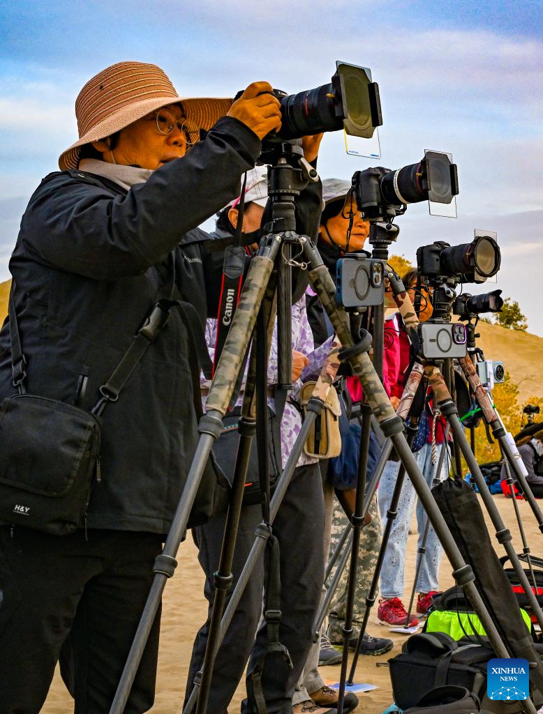 URUMQI, Oct. 29 (Xinhua) -- Standing atop a 100-meter dune in the Huludao scenic area, located in the Bayingolin Mongolian Autonomous Prefecture in northwest China's Xinjiang Uygur Autonomous Region, Helen Wong Lam gazes out at the golden populus euphratica forests, camera in hand.