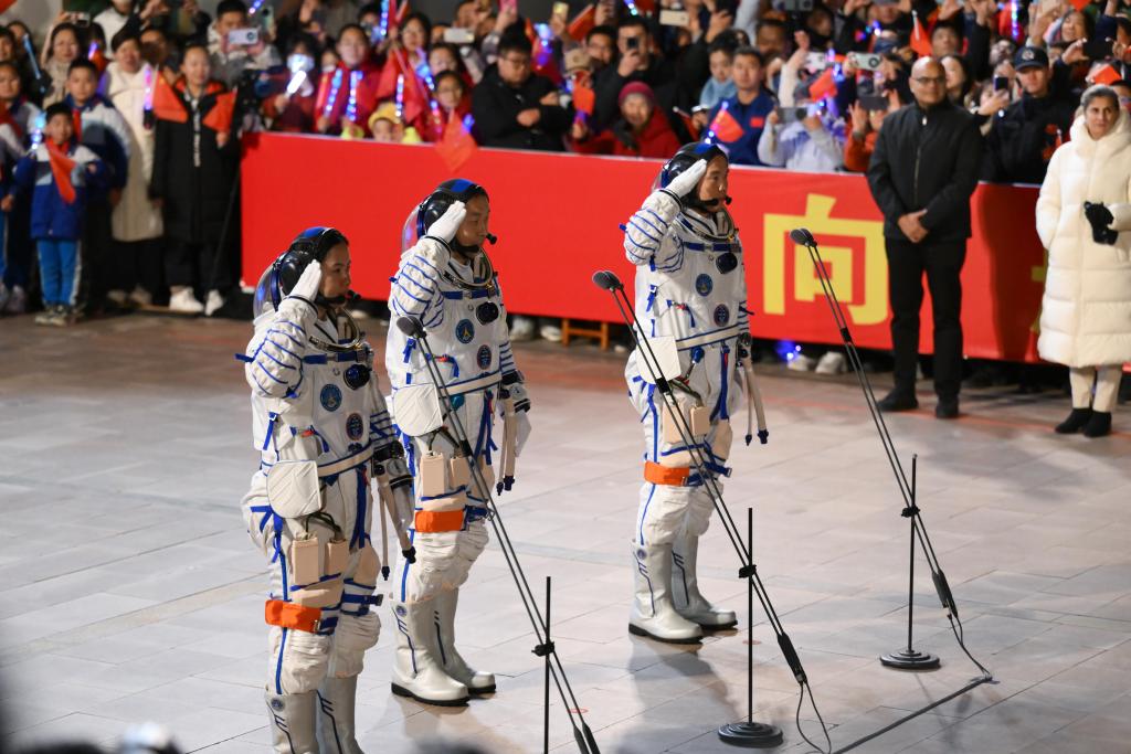 Chinese astronauts Cai Xuzhe (R), Song Lingdong (C) and Wang Haoze attend a see-off ceremony at the Jiuquan Satellite Launch Center in northwest China on Oct. 30, 2024. A see-off ceremony for three Chinese astronauts of the Shenzhou-19 crewed space mission was held early Wednesday morning at the Jiuquan Satellite Launch Center in northwest China. (Xinhua/Li Zhipeng)