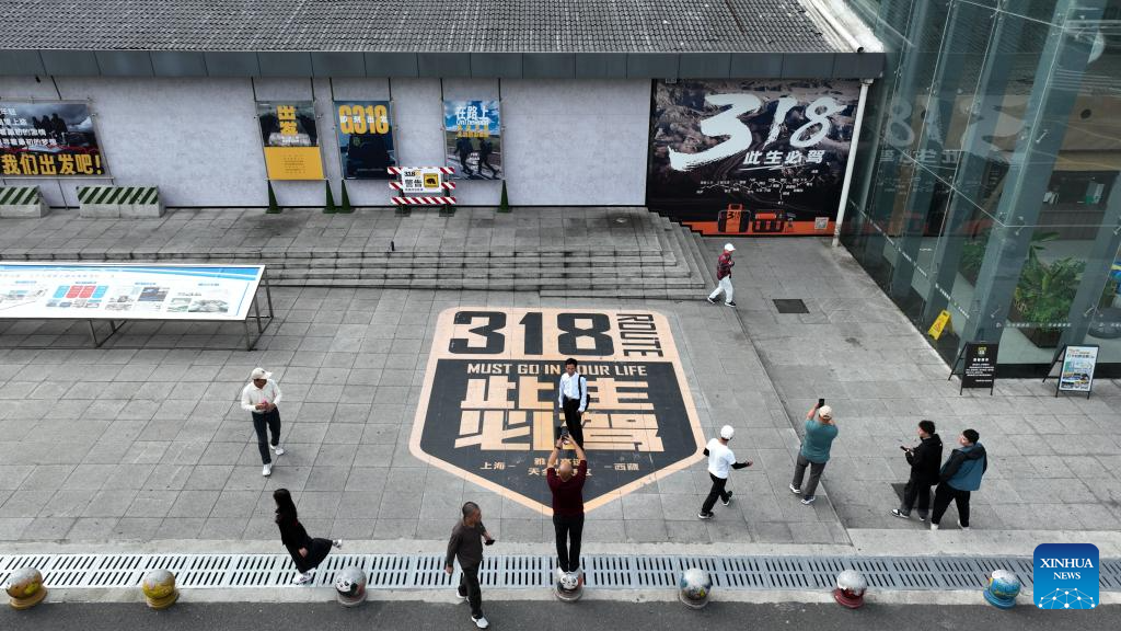 Tourists pose for photos in an exhibition space introducing the National Highway 318 in Ya'an, southwest China's Sichuan Province, Oct. 27, 2024. The Sichuan-Xizang highway connecting southwest China's Sichuan Province and the Xizang Autonomous Region serves as the artery linking the plateau region and the country's inland areas. It is an important part of the National Highway 318 (coded G318), known for steep mountains and rugged terrain through which it winds, and has been bustling with travelers and adventure lovers. In recent years, Ya'an City has made full use of its strategic position along the G318 highway to develop local tourism and enable better experience for tourists. (Xinhua/Wang Xi)