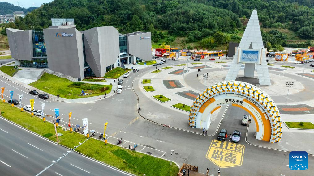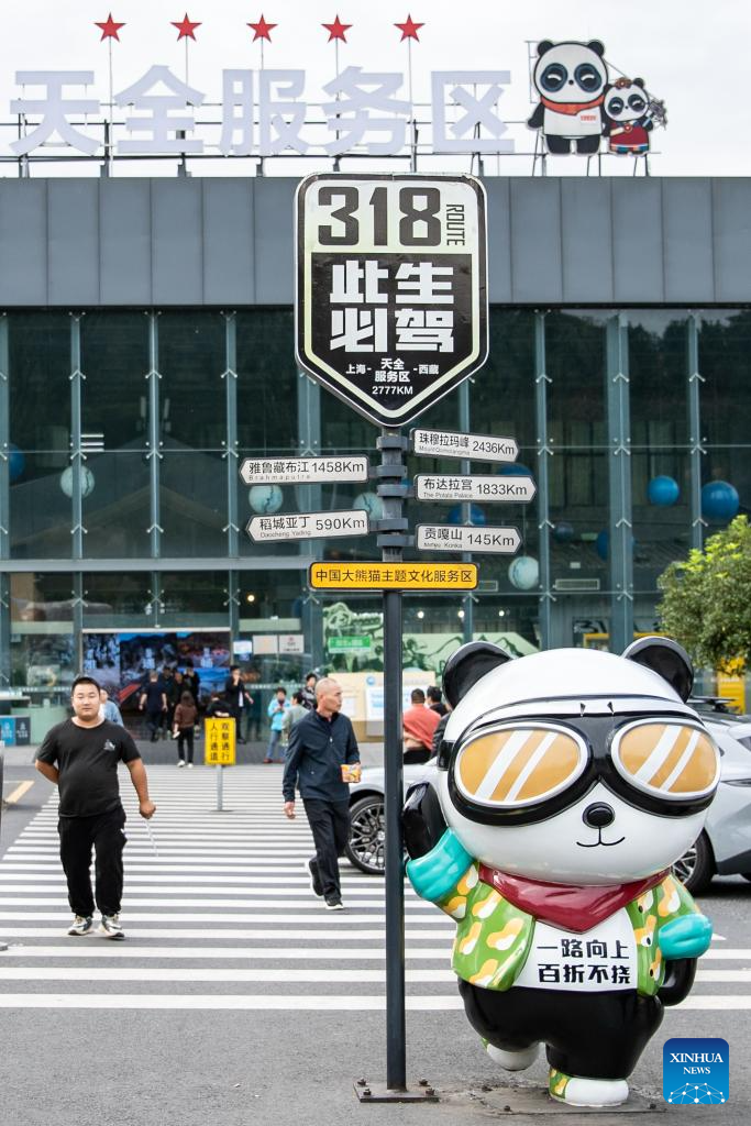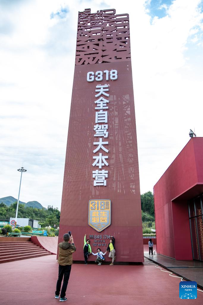 Tourists pose for photos with the mark of a base camp for road trips along the National Highway 318 at Tianquan highway service area in Ya'an City, southwest China's Sichuan Province, Oct. 27, 2024. The Sichuan-Xizang highway connecting southwest China's Sichuan Province and the Xizang Autonomous Region serves as the artery linking the plateau region and the country's inland areas. It is an important part of the National Highway 318 (coded G318), known for steep mountains and rugged terrain through which it winds, and has been bustling with travelers and adventure lovers. In recent years, Ya'an City has made full use of its strategic position along the G318 highway to develop local tourism and enable better experience for tourists. (Xinhua/Chu Jiayin)