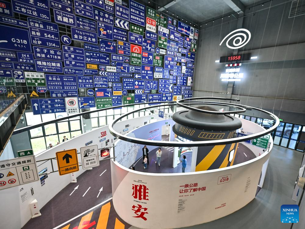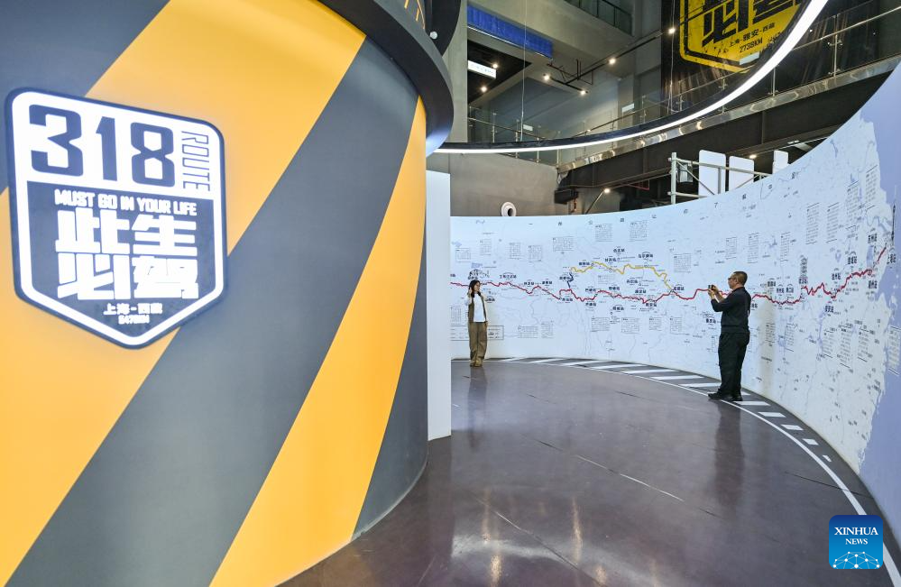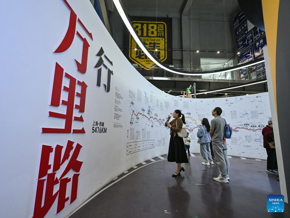 Tourists visit an exhibition space introducing the National Highway 318 in Ya'an, southwest China's Sichuan Province, Oct. 27, 2024. The Sichuan-Xizang highway connecting southwest China's Sichuan Province and the Xizang Autonomous Region serves as the artery linking the plateau region and the country's inland areas. It is an important part of the National Highway 318 (coded G318), known for steep mountains and rugged terrain through which it winds, and has been bustling with travelers and adventure lovers. In recent years, Ya'an City has made full use of its strategic position along the G318 highway to develop local tourism and enable better experience for tourists. (Xinhua/Wang Xi)