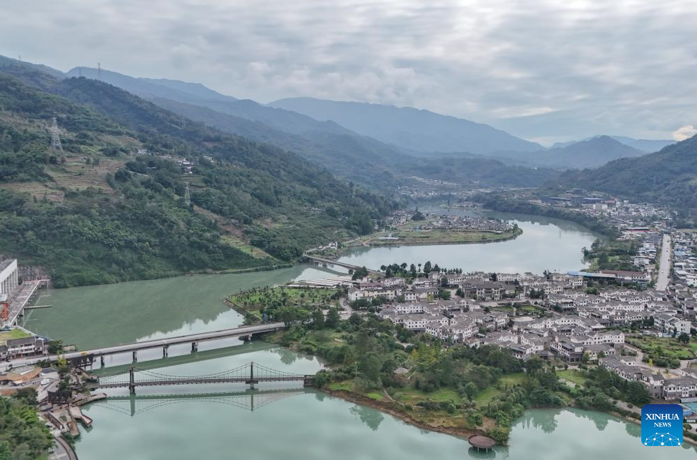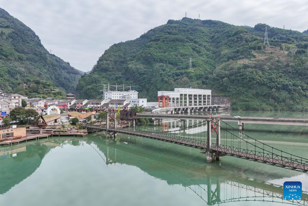 This drone photo taken on Oct. 27, 2024 shows the Feixian'guan suspension bridge (front) and the newly built Feixian'guan bridge (back) in Lushan County, Ya'an City, southwest China's Sichuan Province. The Sichuan-Xizang highway connecting southwest China's Sichuan Province and the Xizang Autonomous Region serves as the artery linking the plateau region and the country's inland areas. It is an important part of the National Highway 318 (coded G318), known for steep mountains and rugged terrain through which it winds, and has been bustling with travelers and adventure lovers. In recent years, Ya'an City has made full use of its strategic position along the G318 highway to develop local tourism and enable better experience for tourists. (Xinhua/Wang Xi)