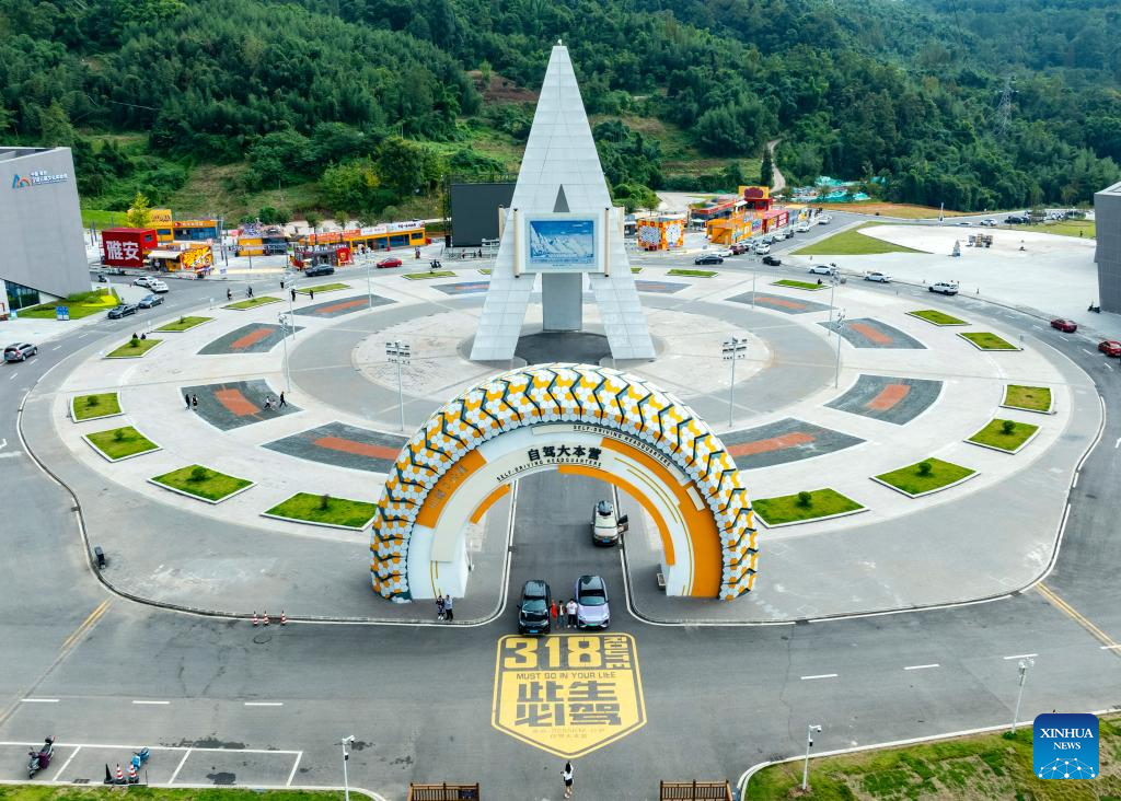 This drone photo taken on Oct. 27, 2024 shows tourists posing for photos with a mark of the National Highway 318 at Tianquan highway service area in Ya'an City, southwest China's Sichuan Province. The Sichuan-Xizang highway connecting southwest China's Sichuan Province and the Xizang Autonomous Region serves as the artery linking the plateau region and the country's inland areas. It is an important part of the National Highway 318 (coded G318), known for steep mountains and rugged terrain through which it winds, and has been bustling with travelers and adventure lovers. In recent years, Ya'an City has made full use of its strategic position along the G318 highway to develop local tourism and enable better experience for tourists. (Xinhua/Xu Bingjie)