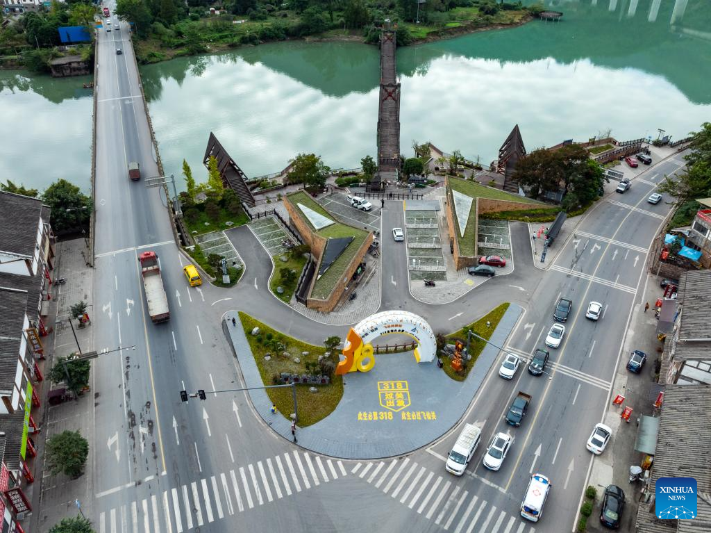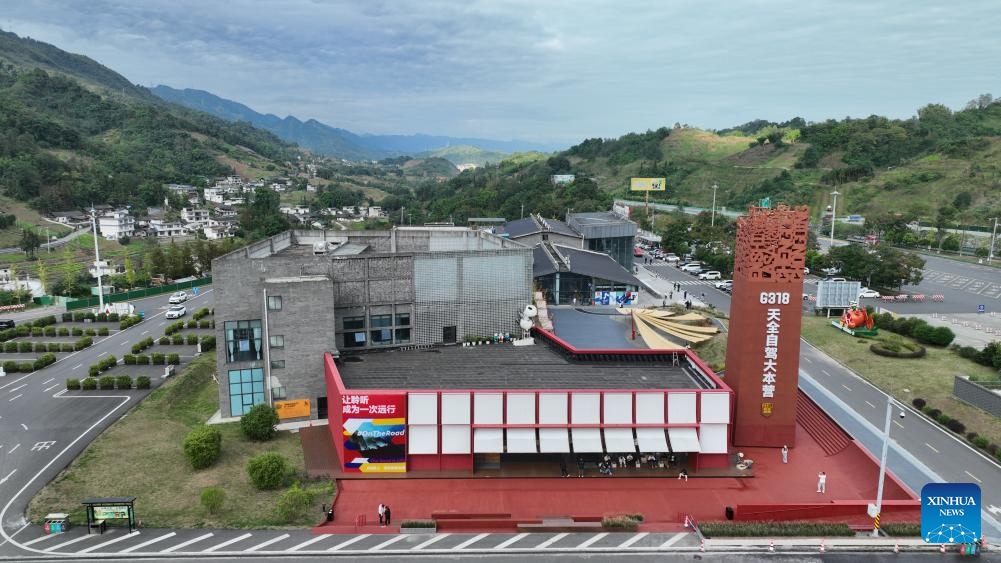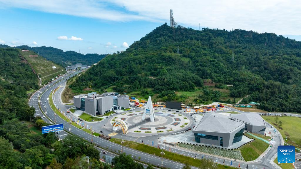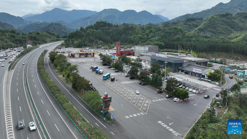 This photo taken on Oct. 27, 2024 shows a view of the Tianquan highway service area in Ya'an City, southwest China's Sichuan Province. The Sichuan-Xizang highway connecting southwest China's Sichuan Province and the Xizang Autonomous Region serves as the artery linking the plateau region and the country's inland areas. It is an important part of the National Highway 318 (coded G318), known for steep mountains and rugged terrain through which it winds, and has been bustling with travelers and adventure lovers. In recent years, Ya'an City has made full use of its strategic position along the G318 highway to develop local tourism and enable better experience for tourists. (Xinhua/Chu Jiayin)