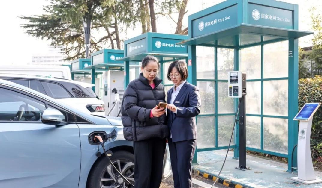 A staff member of the electric power research institute of State Grid Jiangsu Electric Power Co., Ltd. guides a woman to use smart charging services at a charging station in Wuxi, Jiangsu province. (Photo from China Electric Power News)
