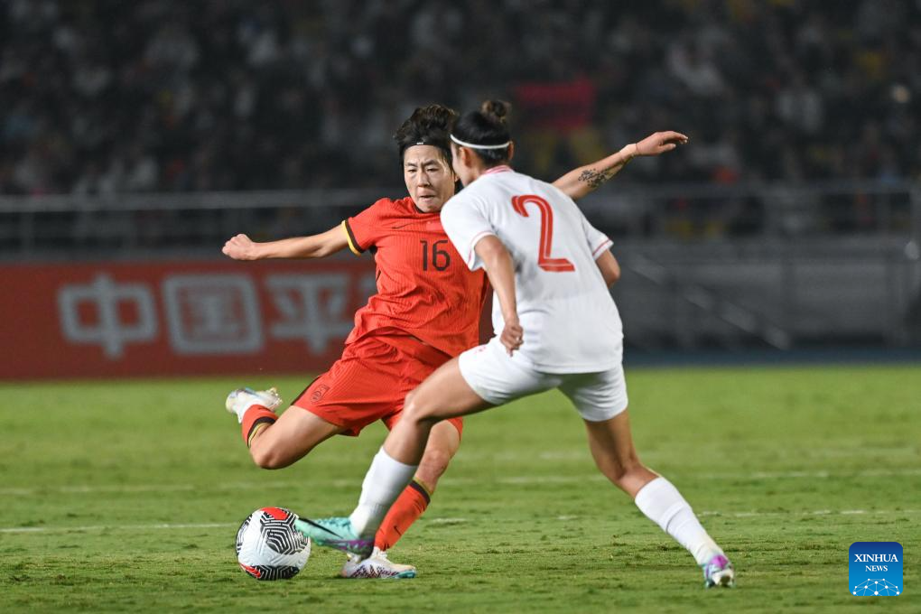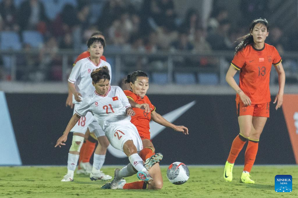 Zhang Rui (R) of China vies with Nguyen Thi Truc Huong of Vietnam during the match at 2024 CFA Team China International Women's Football Tournament Yongchuan in Chongqing, southwest China, Oct. 29, 2024. (Xinhua/Huang Wei)