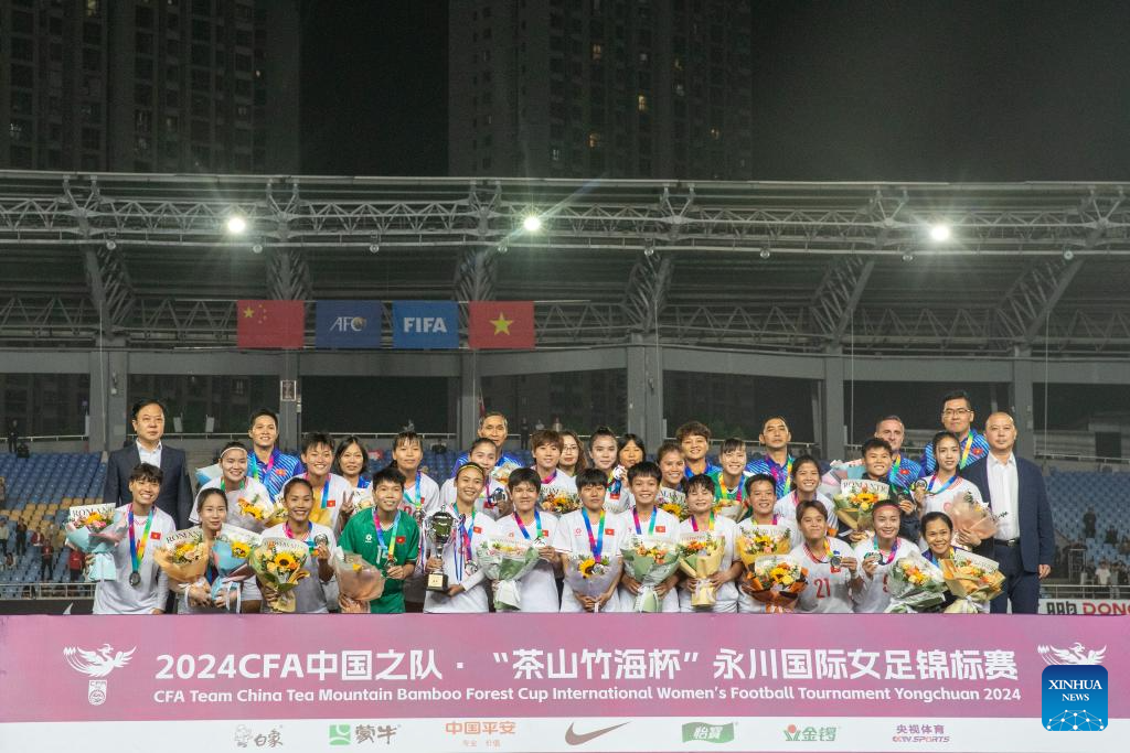 Second place winner Team Vietnam celebrate during the awarding ceremony after the match between China and Vietnam at 2024 CFA Team China International Women's Football Tournament Yongchuan in Chongqing, southwest China, Oct. 29, 2024. (Xinhua/Huang Wei)