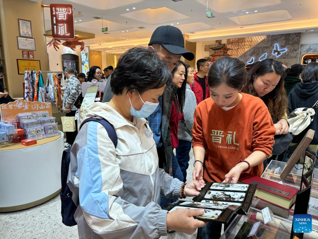 Tourists select creative cultural products at a gift shop in Taiyuan, north China's Shanxi Province, Oct. 13, 2024. (Xinhua/Wang Xuetao)