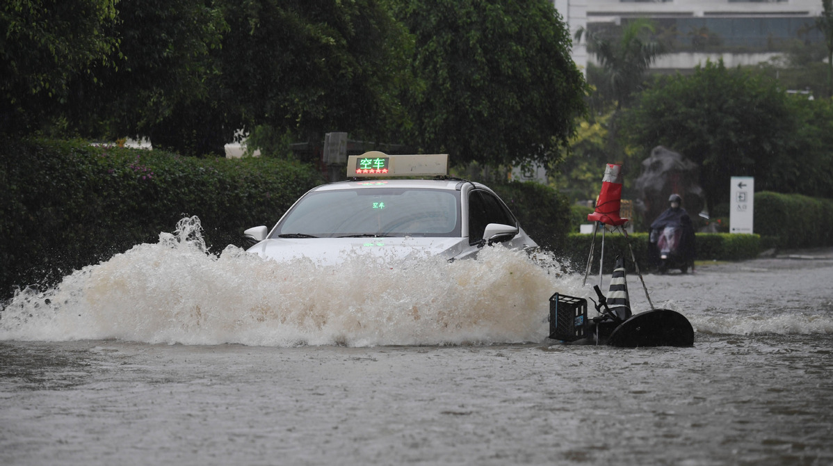 A taxi moves through a waterlogged road in Sanya, South China's Hainan province, Oct 28, 2024. Some parts of Hainan province experienced heavy rainfall due to the influence of Typhoon Trami. (Photo/Xinhua)