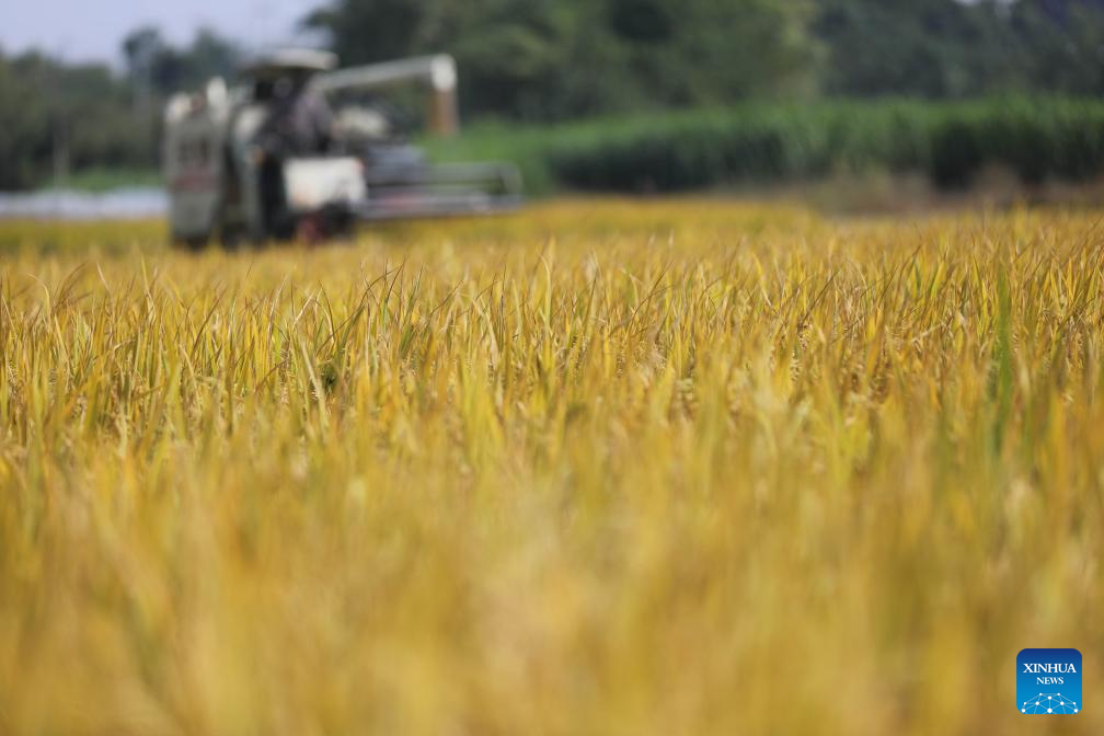 A harvester works at a late rice field in Changqing Village, Daoxian County, central China's Hunan Province, Oct. 30, 2024. (Photo by He Hongfu/Xinhua)