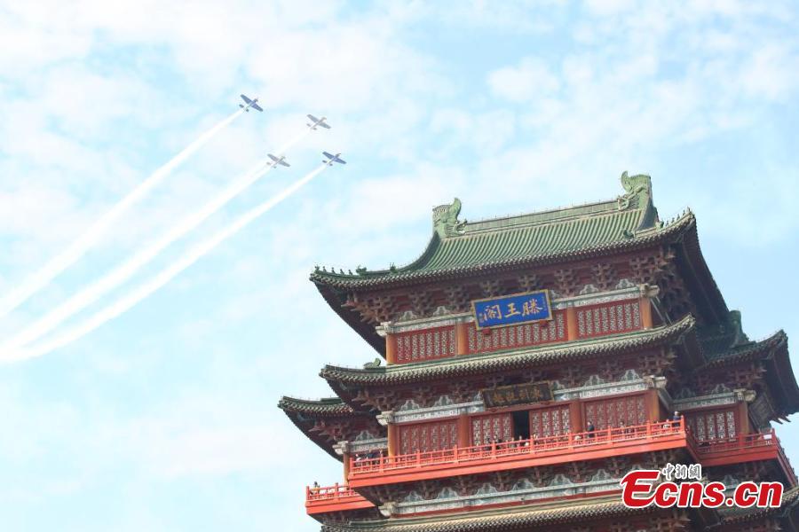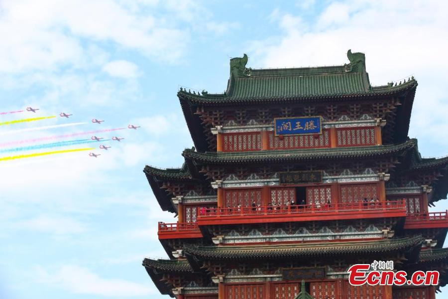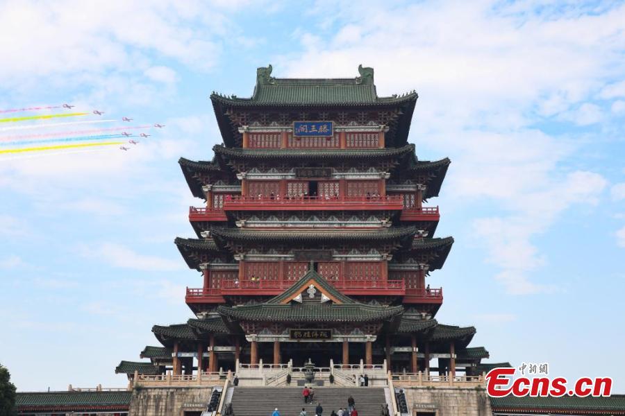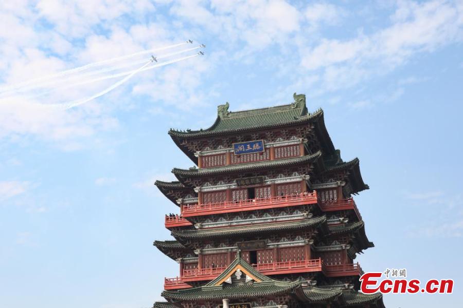 China's Hongying (or Red Eagle) Aerobatic Team of the PLA Air Force Aviation University flies over Tengwang Pavilion ahead of the 2024 Nanchang Air Show in east China's Jiangxi Province, Oct. 30, 2024. (Photo: China News Service/Liu Siwei)