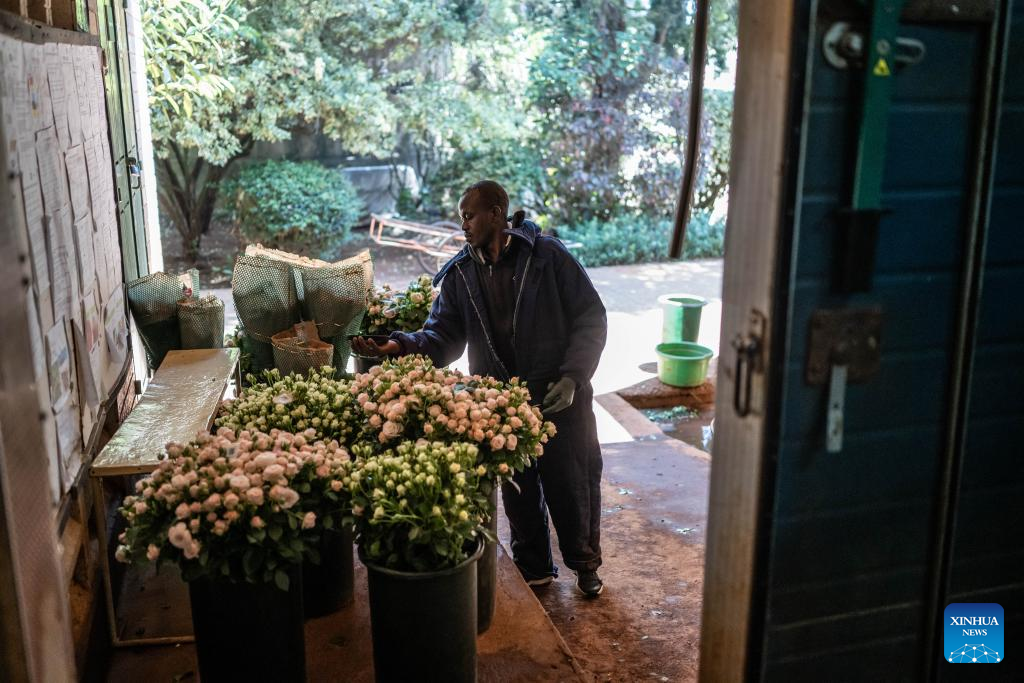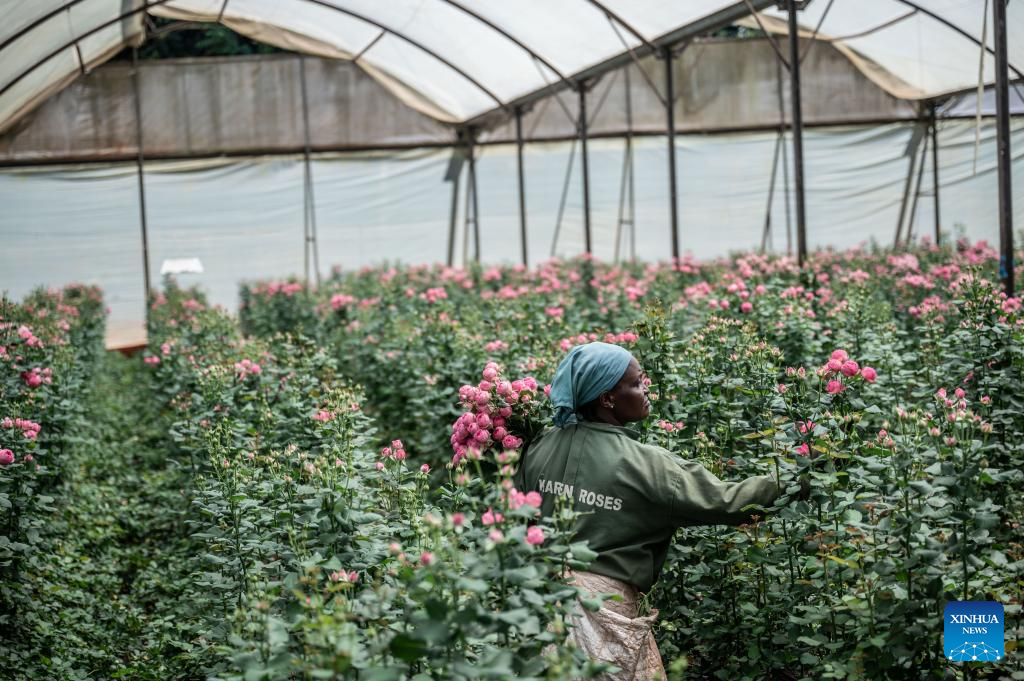 A worker from Karen Roses picks flowers at a greenhouse in Nairobi, Kenya, on Oct. 29, 2024. (Xinhua/Wang Guansen)