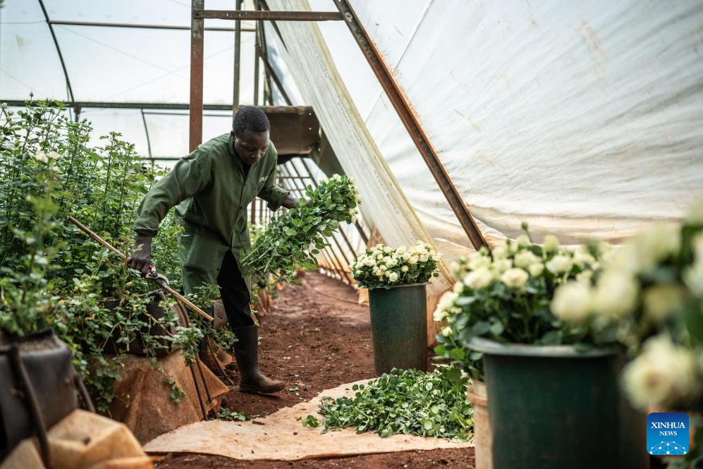 A worker from Karen Roses prunes flowers at a greenhouse in Nairobi, Kenya, on Oct. 29, 2024. (Xinhua/Wang Guansen)