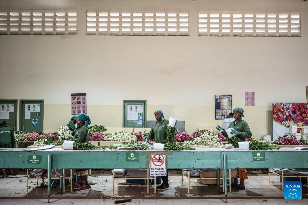 Workers from Karen Roses prune flowers at a workshop in Nairobi, Kenya, on Oct. 29, 2024. (Xinhua/Wang Guansen)