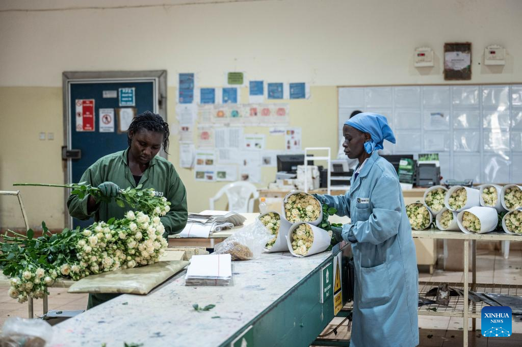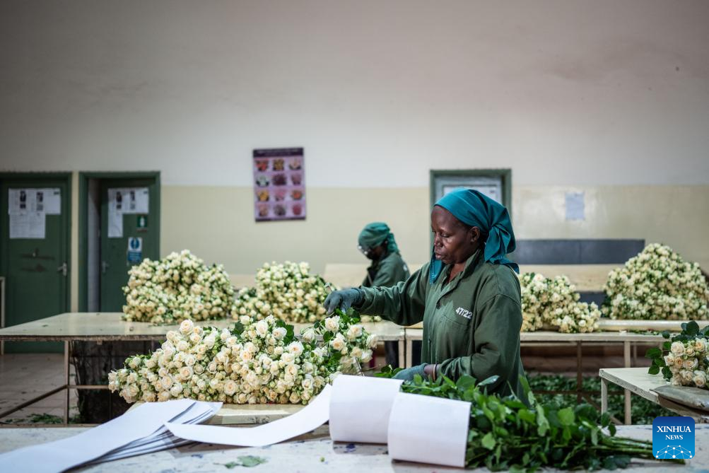 A worker from Karen Roses arranges packed flowers at a workshop in Nairobi, Kenya, on Oct. 29, 2024. (Xinhua/Wang Guansen)