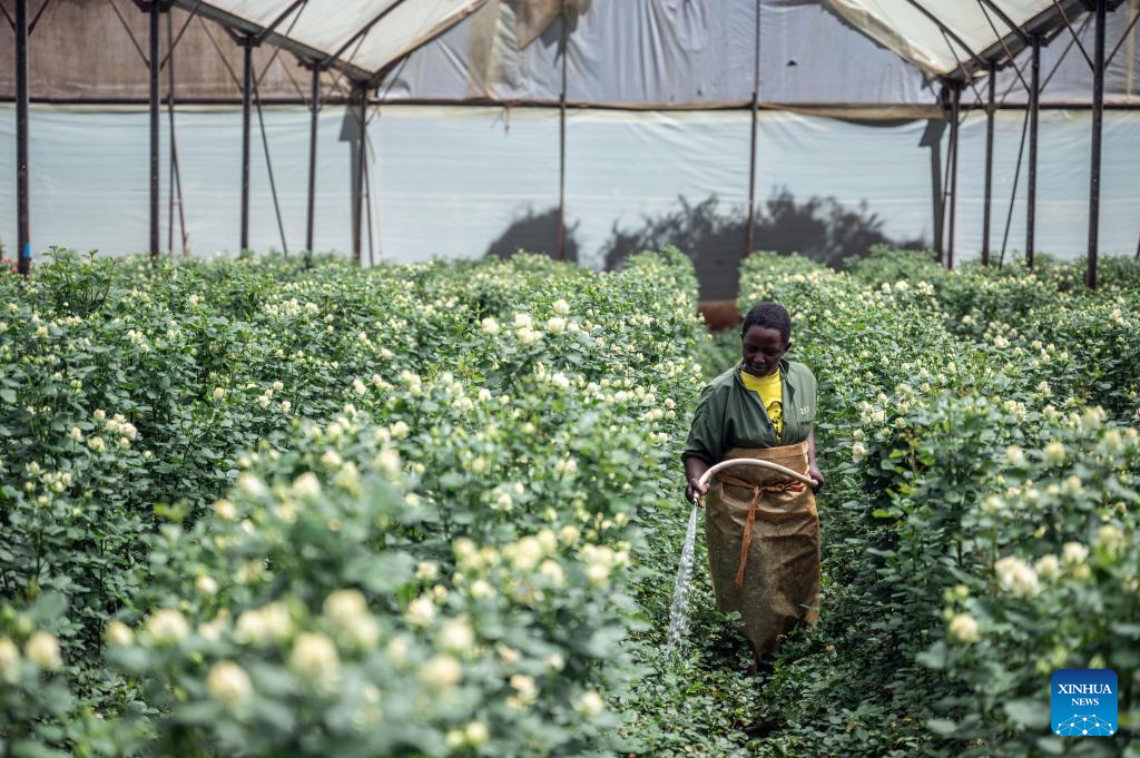 A worker from Karen Roses waters flowers at a greenhouse in Nairobi, Kenya, on Oct. 29, 2024. (Xinhua/Wang Guansen)