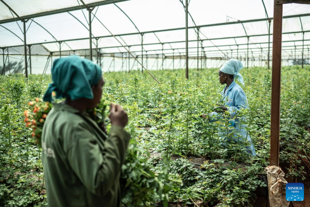 Workers from Karen Roses prune flowers at a greenhouse in Nairobi, Kenya, on Oct. 29, 2024. (Xinhua/Wang Guansen)