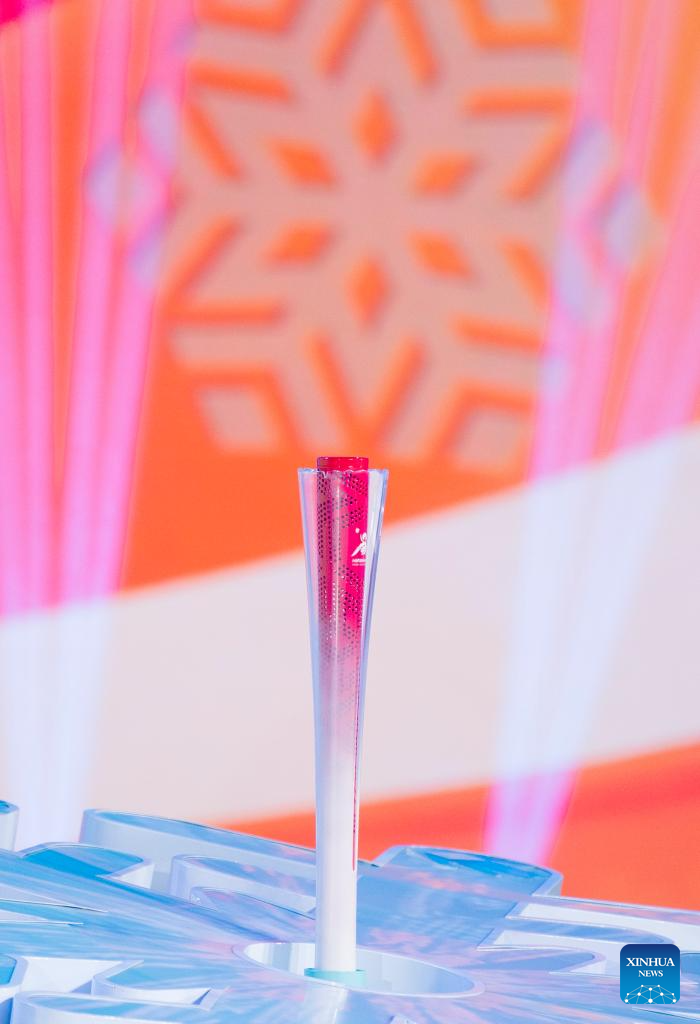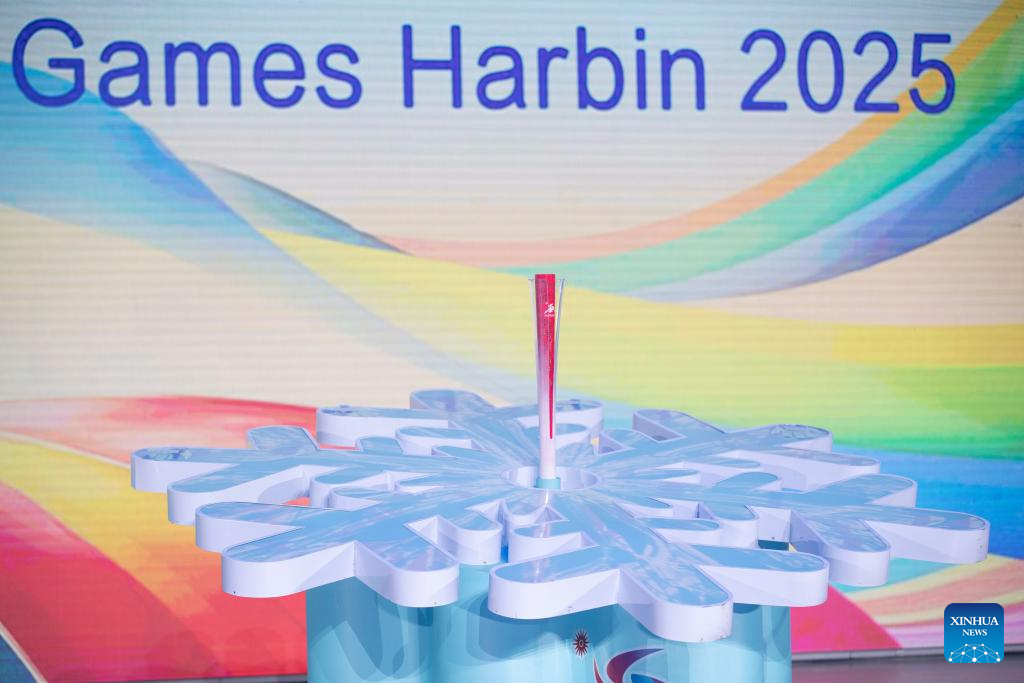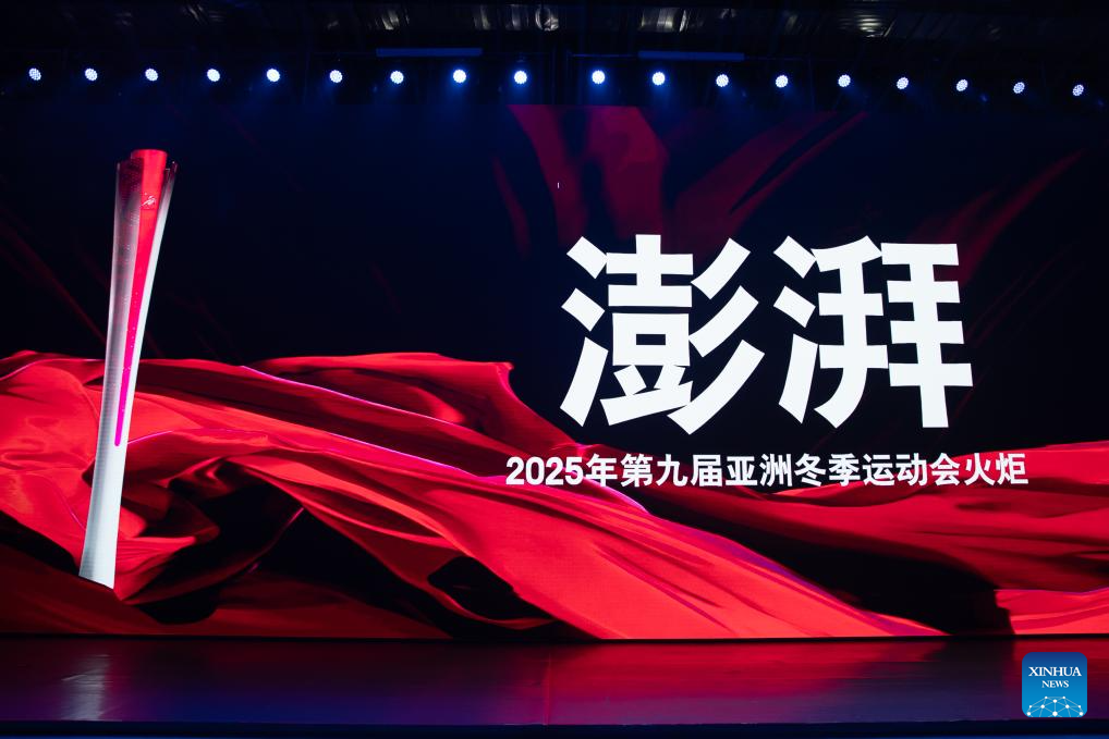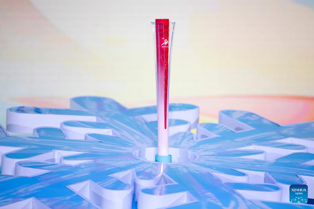 The 9th Asian Winter Games torch is unveiled during a ceremony celebrating the 100-day countdown to the 9th Asian Winter Games Harbin 2025 in Harbin, northeast China's Heilongjiang Province, Oct. 30, 2024. (Xinhua/Zhang Tao)