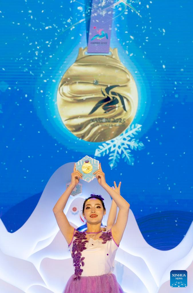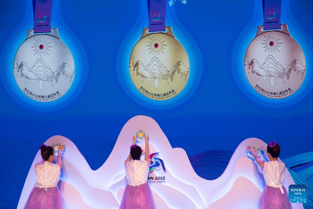 The 9th Asian Winter Games medals are unveiled during a ceremony celebrating the 100-day countdown to the 9th Asian Winter Games Harbin 2025 in Harbin, northeast China's Heilongjiang Province, Oct. 30, 2024. (Xinhua/Zhang Tao)