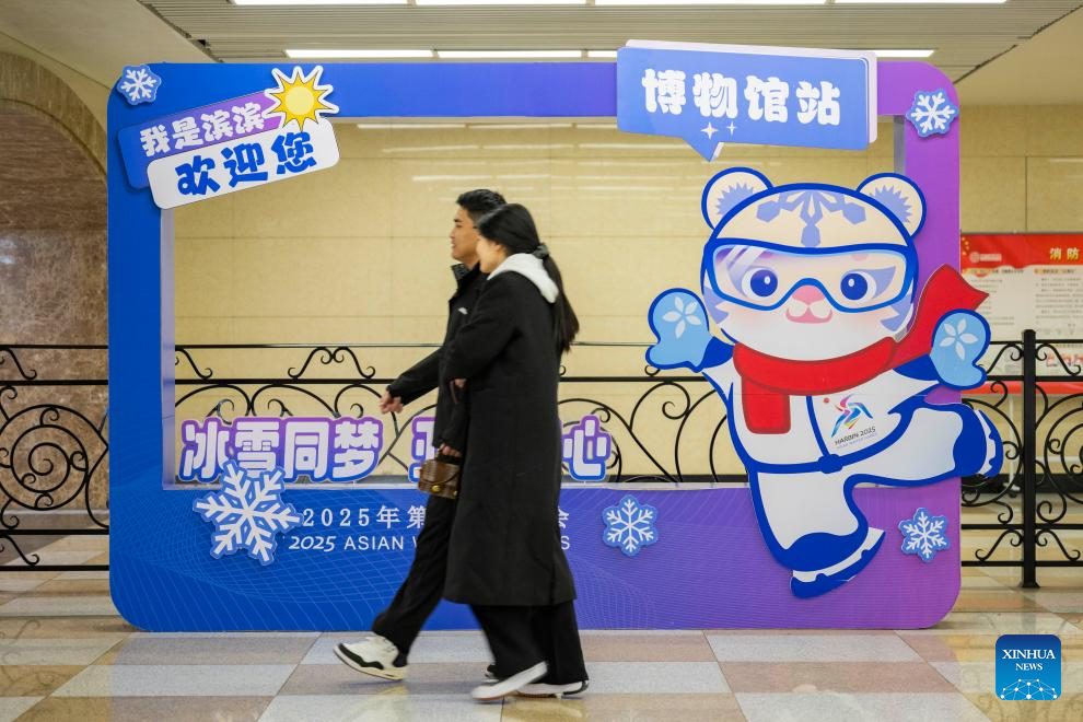 People pass by a theme decoration in a subway station in Harbin, northeast China's Heilongjiang Province, Oct. 30, 2024. The countdown to the 9th Asian Winter Games Harbin 2025 hit the 100-day mark on Oct. 30, 2024. (Xinhua/Xie Jianfei)