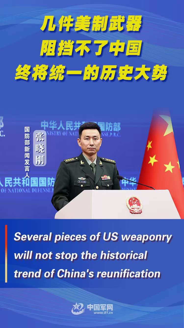The Taiwan question is at the very core of China's core interests, and the first red line that must not be crossed in China-US relations. China urges the US to fully recognize the severe consequences of arming Taiwan which would surely backfire, and not to go further down the wrong path. Several pieces of US weaponry will not close the cross-strait military power gap, still less stop the historical trend of China's reunification. The PLA will continuously improve its combat readiness, comprehensively enhance the military capability to fight and win, and firmly safeguard national sovereignty and territorial integrity.